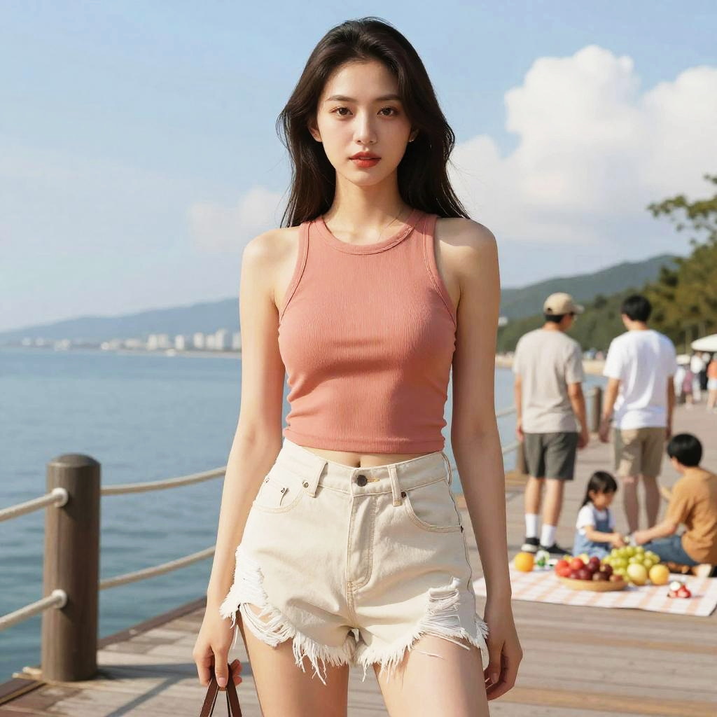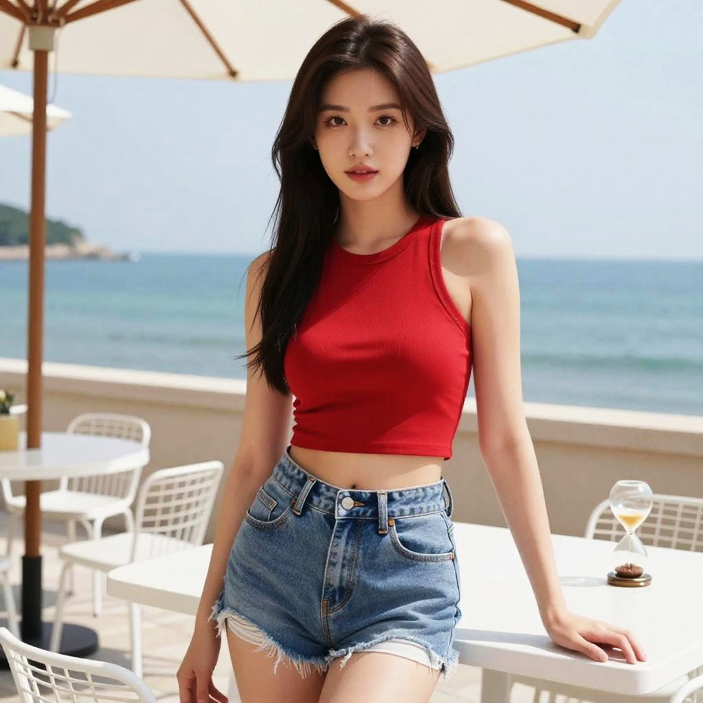 A woman, in a kodansha comics style, wearing a pink cropped top and high-waisted blue jeans, standing at a cafe with umbrellas by the beach. Sexy. Pretty face and beutiful eyes