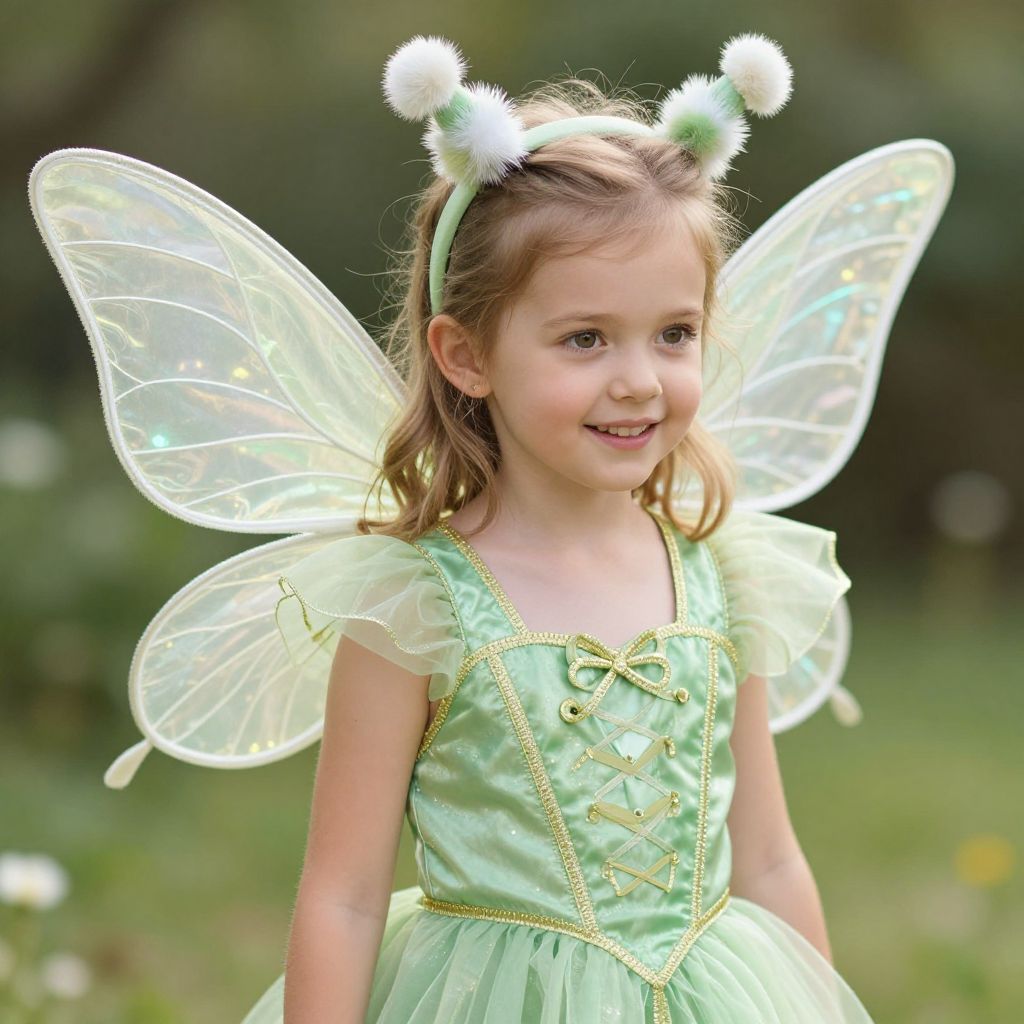 Photograph of a young Caucasian girl with light brown hair, wearing a light green, satin, fairy costume with yellow trim and sparkling details. She has translucent, sparkly fairy wings attached to her back, and a headband with white, fluffy, antennae-like decorations. She is smiling softly, standing in a blurred, green outdoor setting with trees in the background. The costume features a corset-style bodice with laces and a full, tulle skirt. Her skin is fair, and she has light makeup, enhancing her natural features. The overall feel is whimsical and magical.