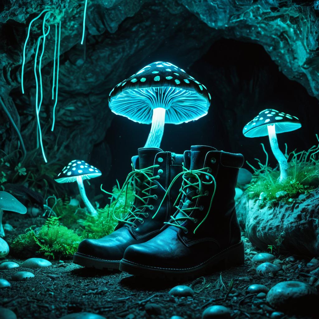 Illustration of bioluminescent mushroom lanterns, styled in a bioluminescent cave grotto. The boots feature intricate detailing, magical illumination, and an ethereal glow, with backgrounds of glowing neon greens and blues. The design conveys fantastical elegance and whimsical ambiance in ultra-detailed 4K resolution.