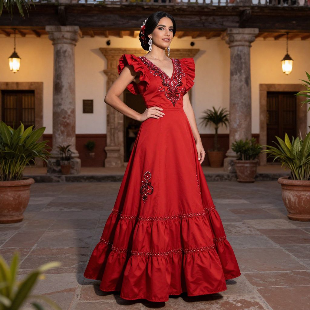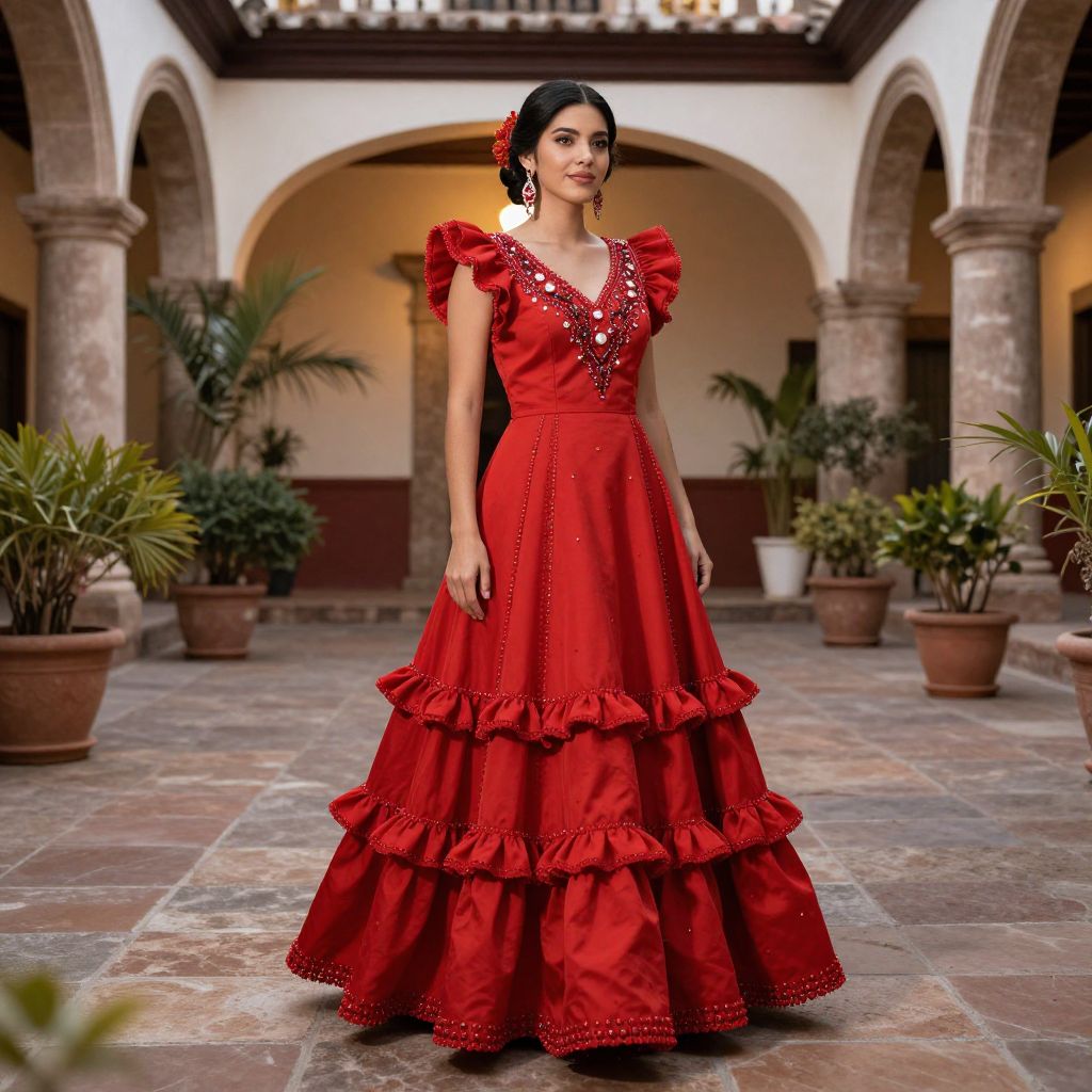 Elegant woman wearing a vibrant red Mexican wedding dress with tiered ruffles and intricate beadwork, standing gracefully in front of a colonial-style courtyard adorned with potted plants and warm ambient lighting.
