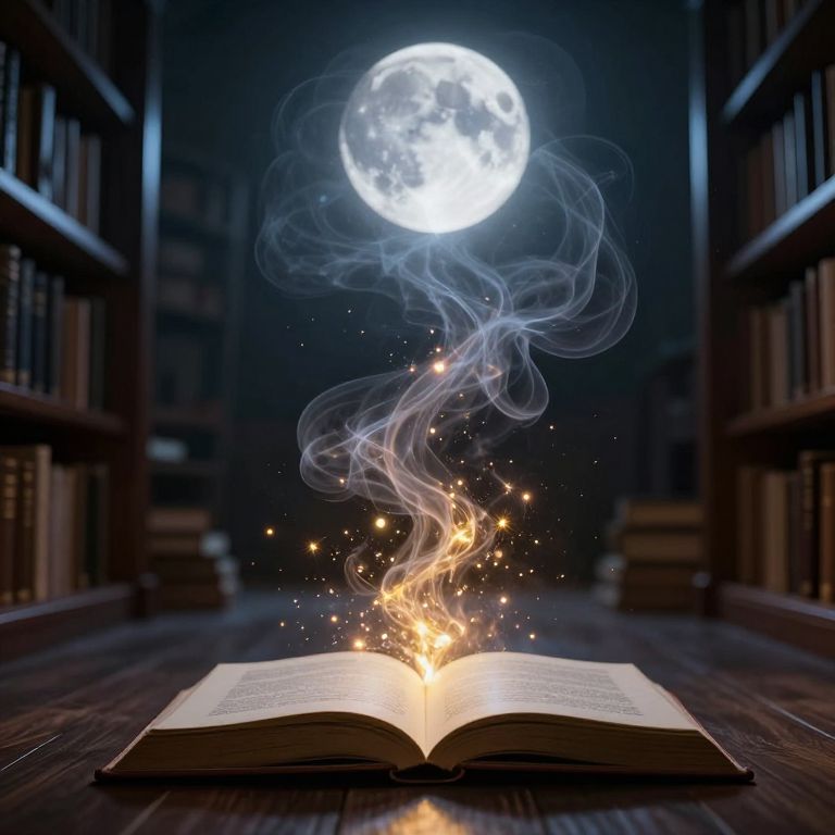 A mystical library bathed in moonlight, where an open book on the floor releases a cascade of golden sparks into a swirling vortex of ethereal smoke, defying gravity as it ascends toward a luminous celestial sphere suspended above.