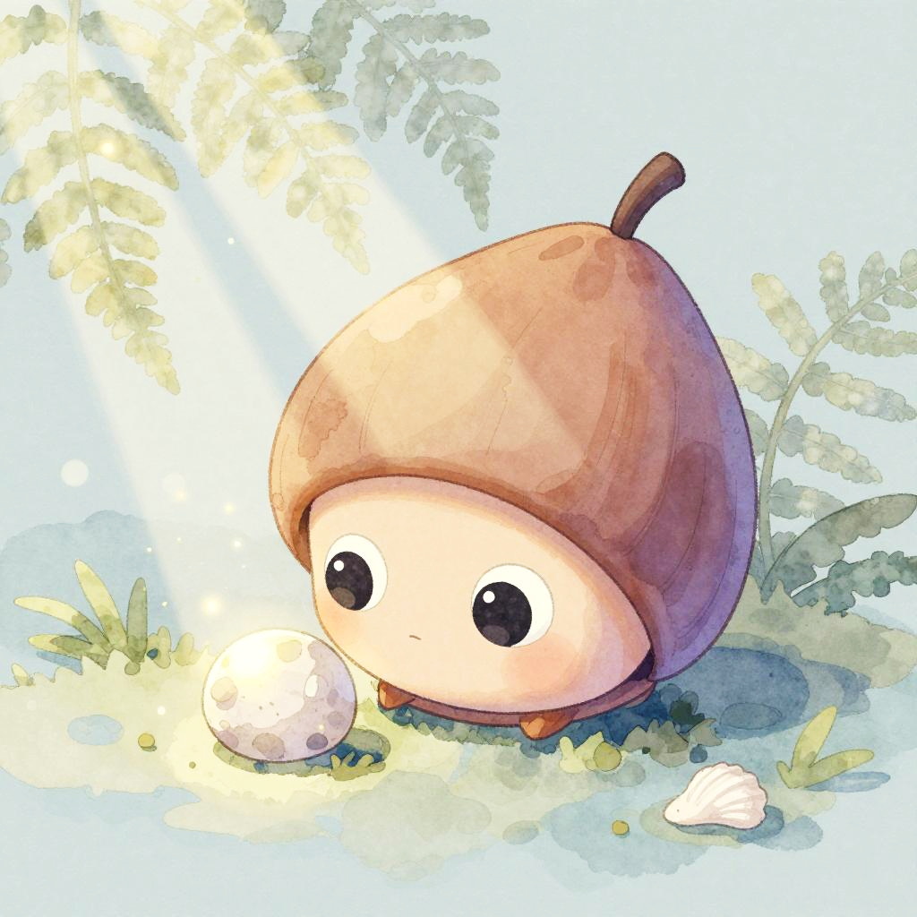 Illustration of a small whimsical alien character with a large teardrop-shaped head and big round eyes peeking out from inside a hollow pastel acorn cap. The alien is curled around a tiny glowing pebble situated on soft grass surrounded by ferns and shells. The scene is depicted in a gentle watercolor style with muted pastel colors, dappled sunbeams filtering through translucent fern fronds, and soft watercolor bokeh effects.