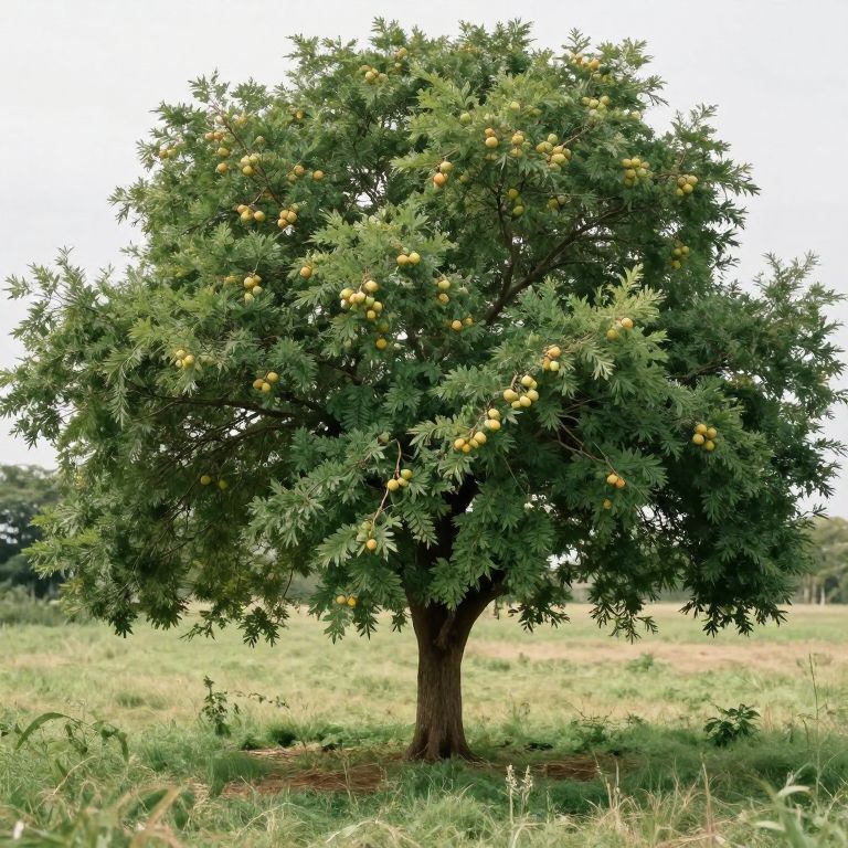 Photograph of a lush, green, fruit-bearing tree with dense foliage and numerous yellow-orange fruits scattered throughout. The tree has a sturdy, brown trunk and stands in a grassy field with wild grasses and small plants around its base. The background is slightly out of focus, showing more greenery and a white, overcast sky. The image has a natural, vibrant color palette and a sharp focus on the tree, highlighting its texture and the fruits. The overall composition is centered, emphasizing the tree's fullness and the abundance of fruit.
