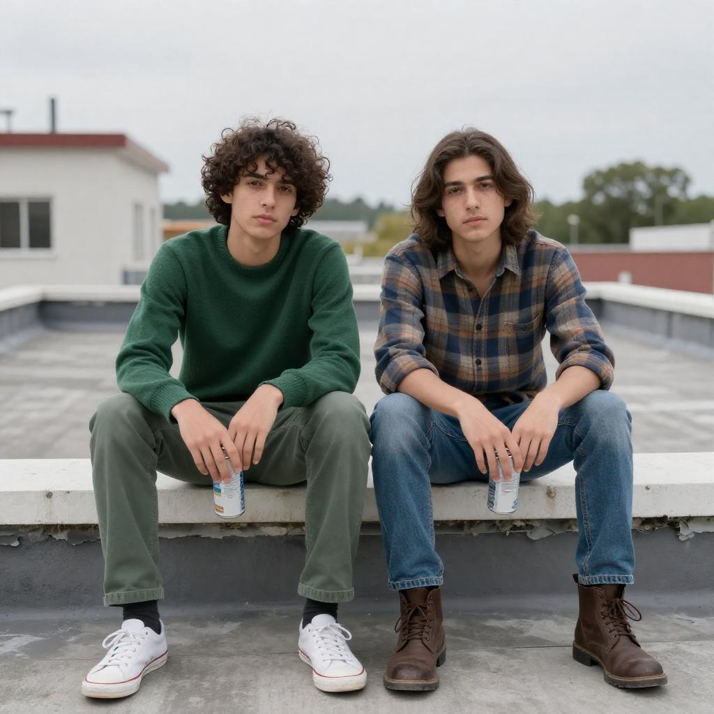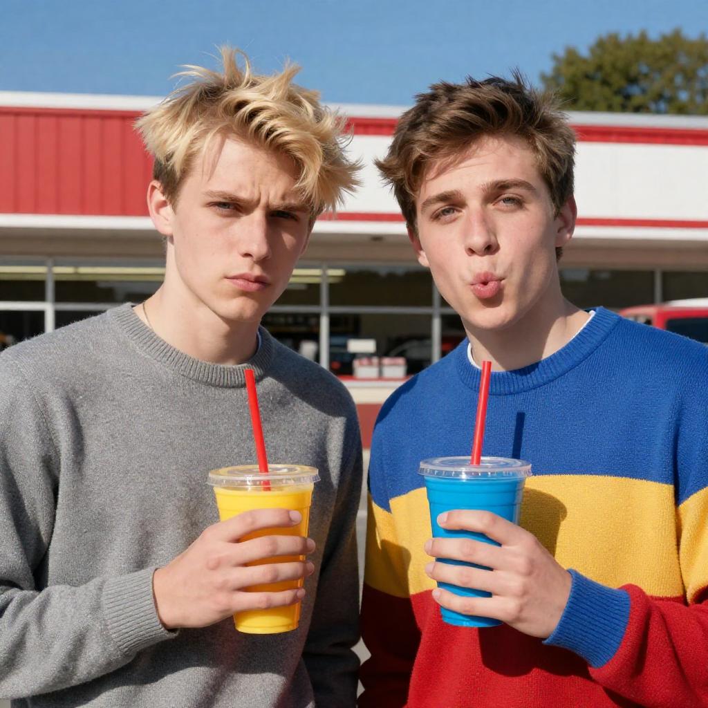 Photograph of two young men standing outdoors. Both have drinks with red straws in yellow and blue cups. The man on the left has messy blonde hair, wears a gray sweater, and looks serious. The man on the right has short brown hair, wears a blue, yellow, and red sweater, and blows a kiss. A red and white grocery store with large windows is in the background. Clear blue sky and trees are visible. Both men are close together, facing the camera.