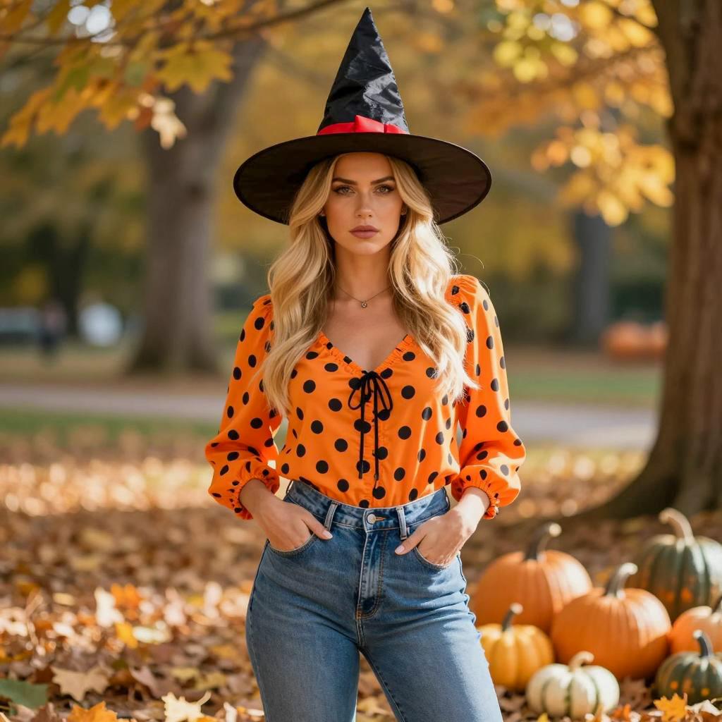 Blonde woman with curled hair, wearing black blazer and black mini skirt, sitting on orange pumpkin, crossed legs, holding smartphone, looking to the side. Night sky with crescent moon, stars, and shooting star in background. Silhouetted city skyline.