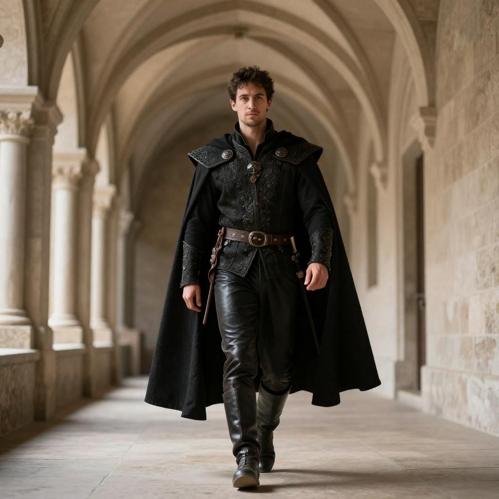 Photograph of a man walking down a medieval stone corridor. He wears a black, ornate vest, leather pants, and boots, with a black cape flowing behind him. The corridor has arched ceilings and stone columns, with sunlight streaming in from the left. The man has short dark hair and a focused expression.