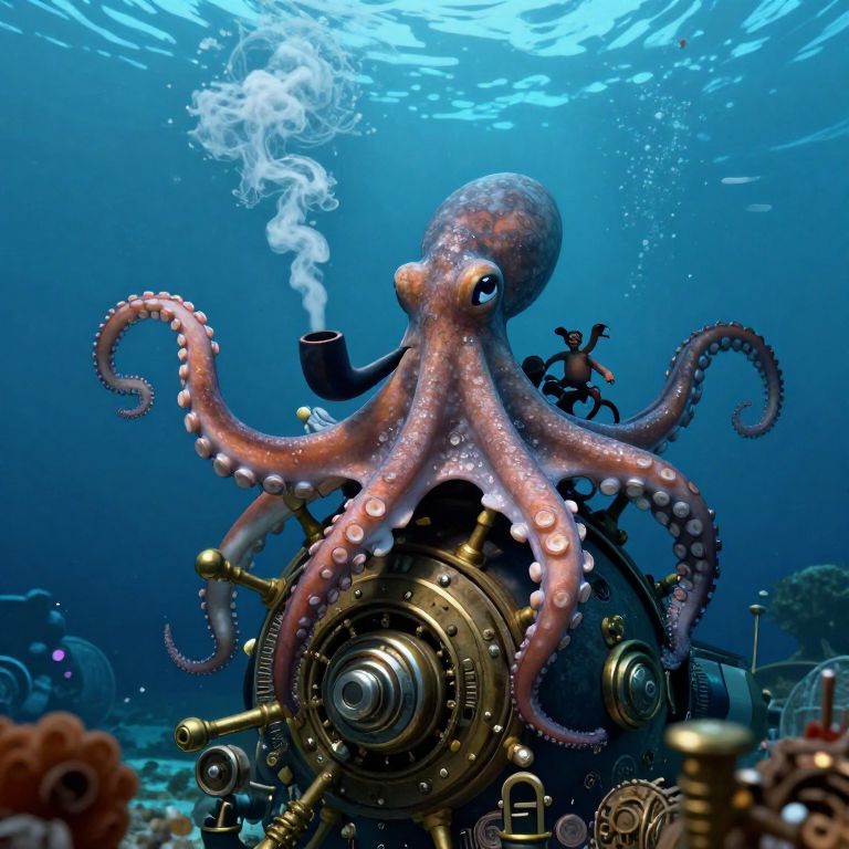 An octopus with a smoking pipe and a small figure on its back stands at the helm of a submarine, surrounded by underwater details and intricate machinery.