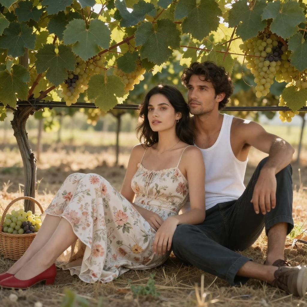 Photograph of a couple in a vineyard. Woman with dark hair, floral dress, and red shoes sits on the ground, leaning against a man with dark hair, white tank top, and dark pants. Man's arm around her, both looking forward. Sunlight filters through green leaves above. Basket of grapes in background.