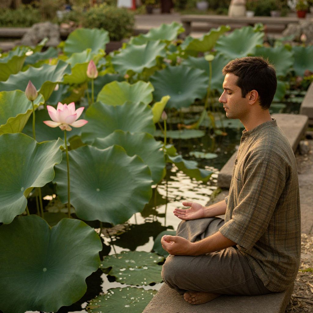 Photograph of a young man with short dark hair and light skin, sitting cross-legged on a stone edge by a pond. He wears a grey, checkered shirt and brown pants, with hands resting on his lap in a meditative pose. The background features large, green lotus leaves with a pink lotus flower in bloom on the left. The pond's water reflects the greenery. The scene is set in a serene garden with blurred foliage and pathways in the background. The lighting is natural, casting soft shadows.
