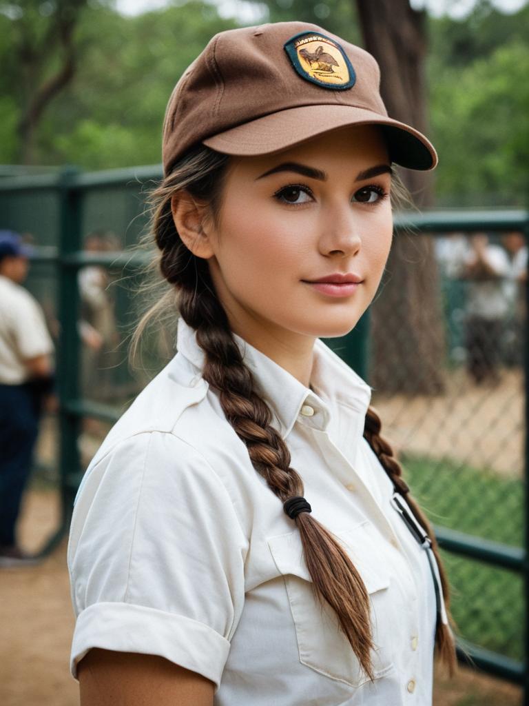 Zoo keeper costume woman, 1girl, solo, hat, blurry background, blurry, realistic, looking at viewer, brown hair, shirt, outdoors, brown eyes, baseball cap, white shirt, upper body, collared shirt, braid, long hair, day