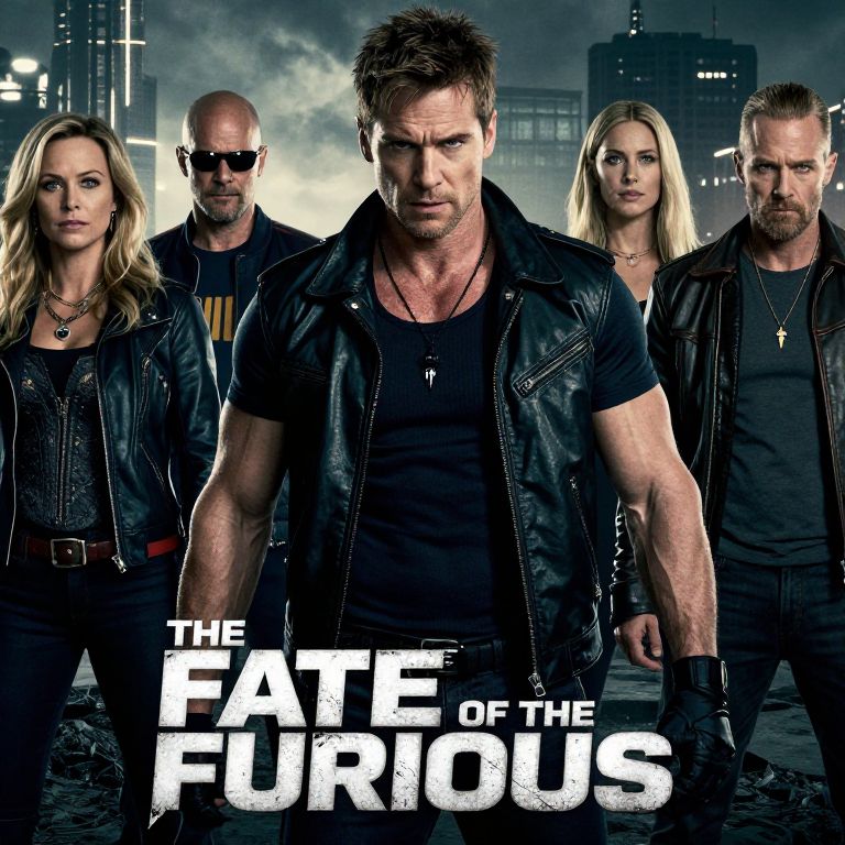 Photograph of a movie poster for "The Fate of the Furious." Four muscular, tough-looking characters stand in front of a dark, urban night skyline with illuminated buildings in the background. The central figure is a rugged man with short, spiked brown hair, wearing a black leather jacket over a black shirt. To his left is a blonde woman with wavy hair, wearing a black leather jacket and necklace. To his right is another blonde woman with straight hair, also in a black leather jacket and necklace. Behind them stands a bald man in a black shirt and sunglasses. The text "THE FATE OF THE FURIOUS" is bold and white at the bottom.