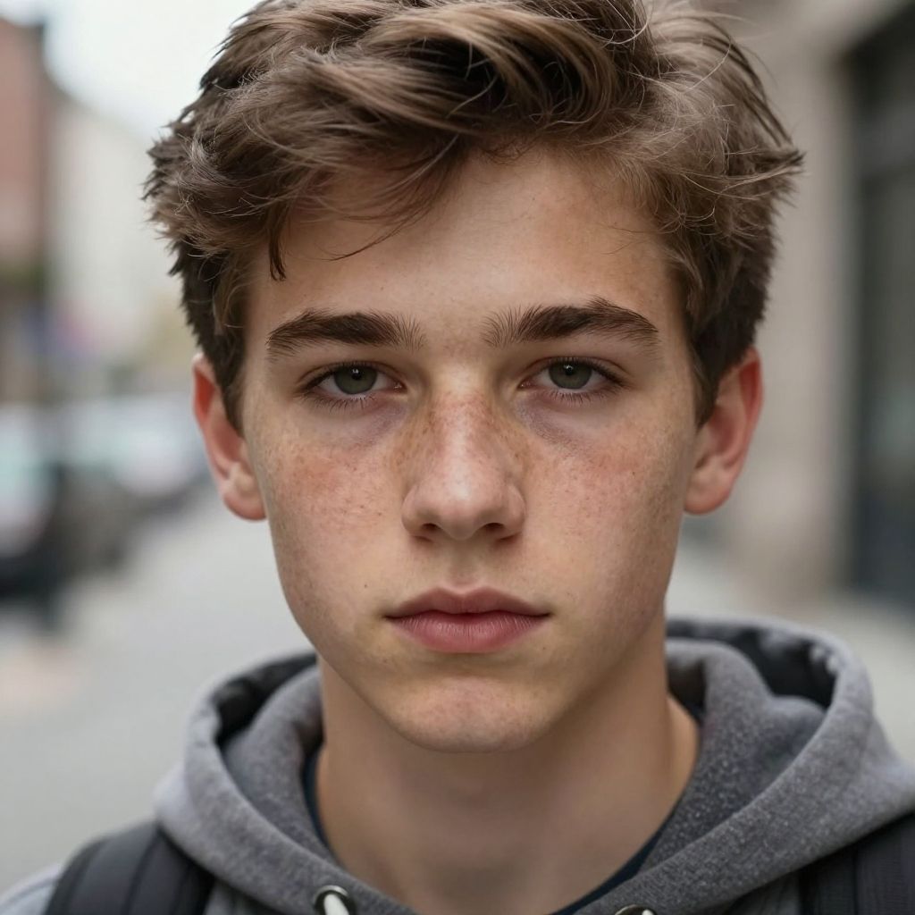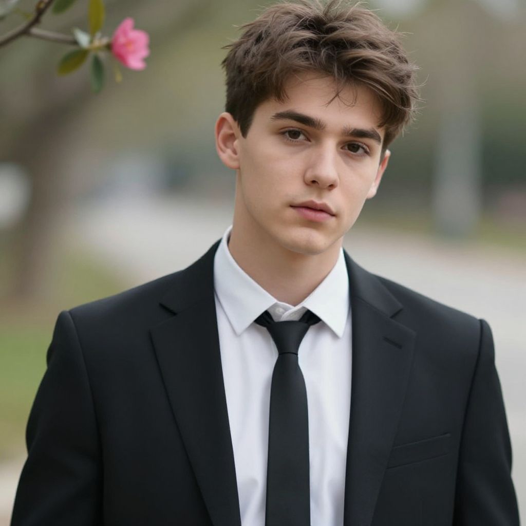 Photorealistic portrait of a young Caucasian man with fair skin, dark brown hair, brown eyes, and black sweater, against a dark blue background.