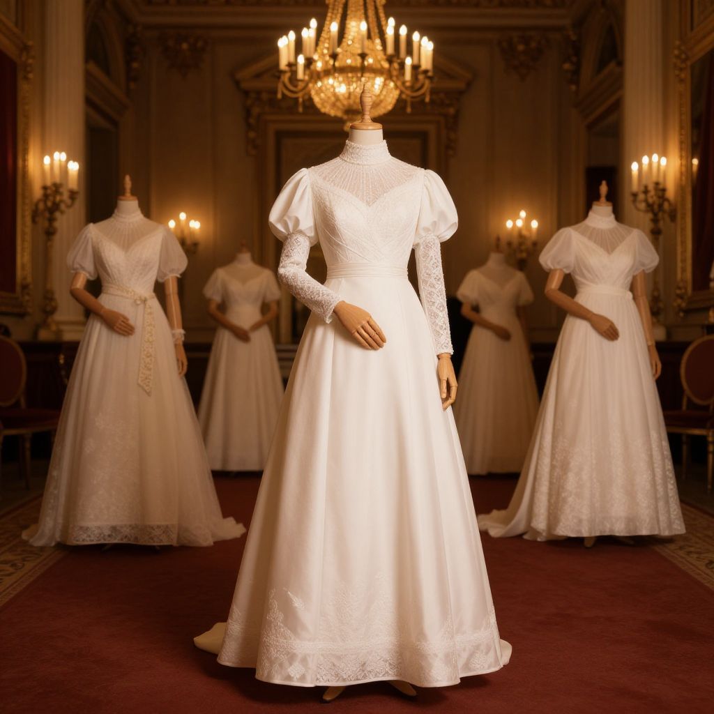 Photograph of a vintage dressmaker's workshop. A young man with curly brown hair and glasses, dressed in a black suit with a yellow measuring tape, sits at a white table, writing in a notebook. On the table are stacks of fabric, a sewing machine, and an open book. Behind him, four dress forms display elegant dresses: one silver with long sleeves, one black with lace, one beige with a waist sash, and one burgundy with gold embroidery. Shelves and an open closet in the background hold more fabrics and garments. The room has beige walls and wooden flooring.