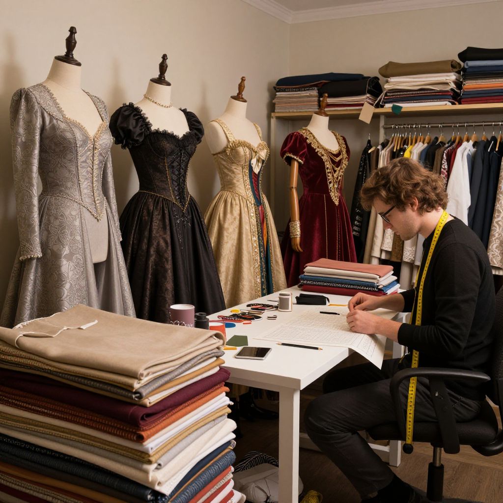 Custom costume maker online, an artisan studio filled with mannequins dressed in thematic costumes, bolts of fabric piled high, an expert tailor measuring and stitching with precision, warm lighting highlighting craftsmanship, elegant and inspiring atmosphere
