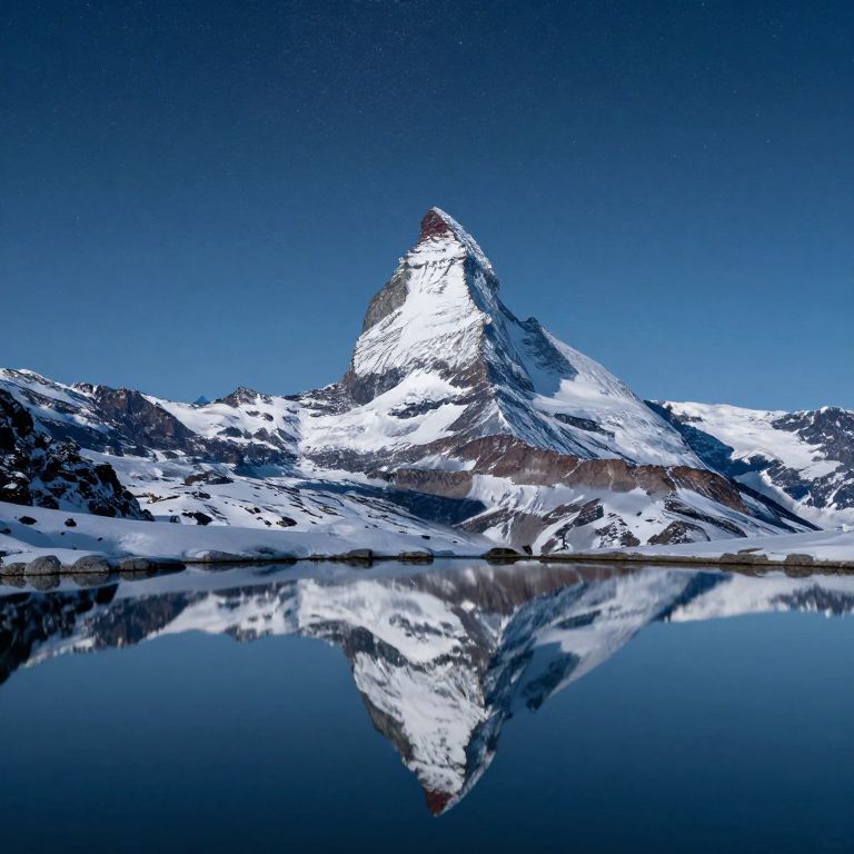 Snow-capped Matterhorn stands majestically against a starry night sky, its sharp peak mirrored perfectly in the tranquil waters below, creating a serene and symmetrical landscape.
