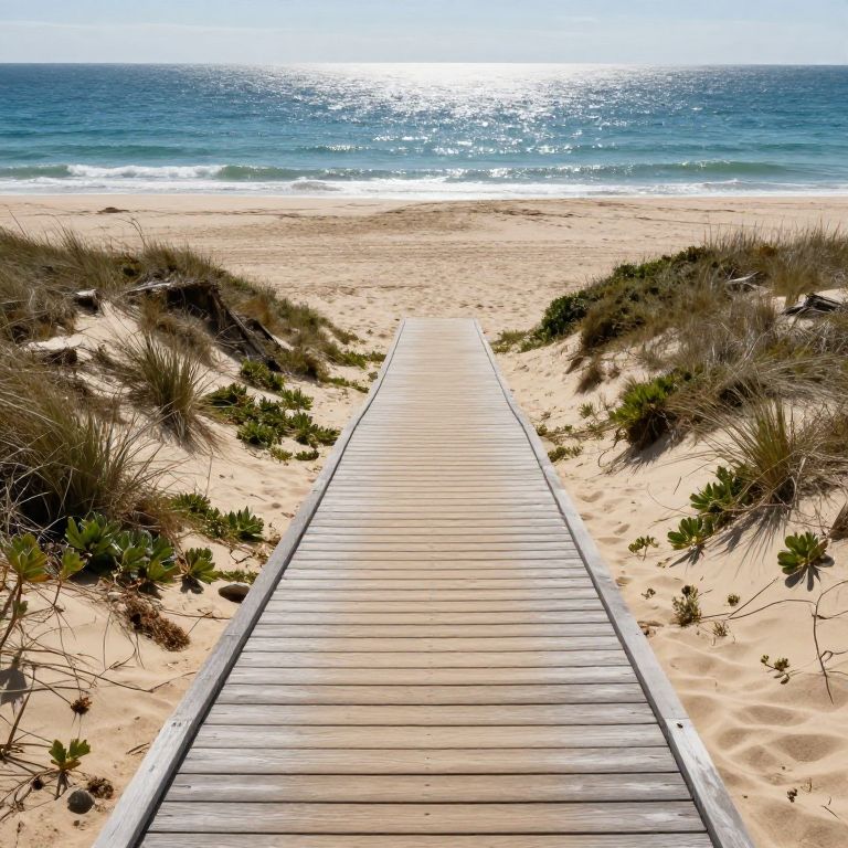 Inbetween Beach sand dune and plant life with curving wooden plank walkway towards sparkling blue ocean, cinematic, wide angle, natural lighting, photo realistic, hyper detailed,