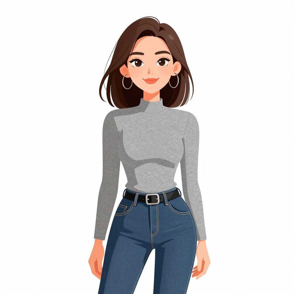 Woman with pretty face and pretty hair. smiling Woman, casual, heather grey mock neck top, long sleeves, fitted, blue skinny jeans, medium wash, classic belt loops with a black belt, silver buckle, minimal detailing. --sref 1467