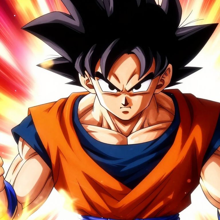 Dragon Ball Z portrait featuring a fierce fighter in iconic outfit, bold shadows and highlights accentuating determined face, vivid colors and detailed hair strands, intense action pose with energy sparks flying, anime-inspired style with sharp lines and dynamic composition.