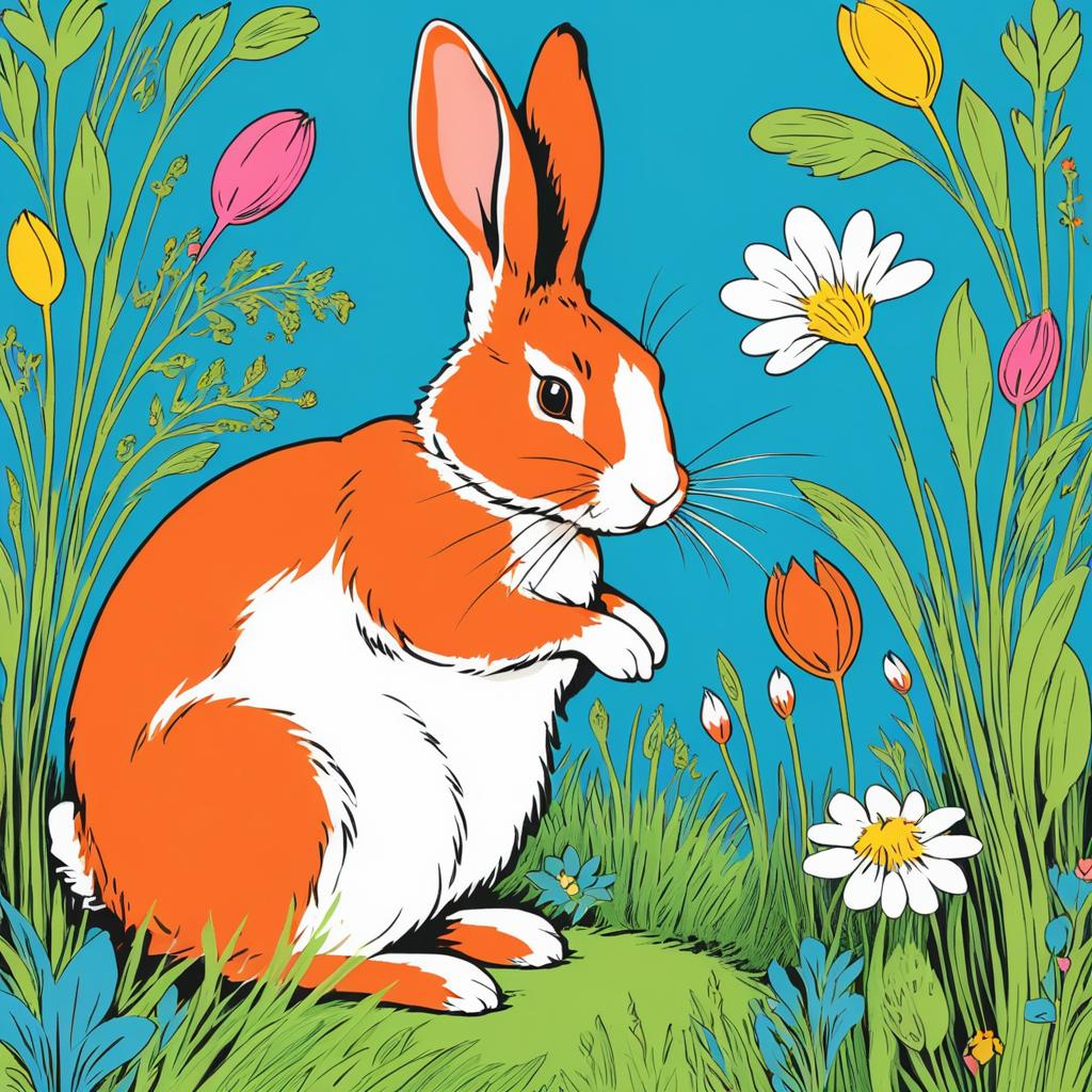 Whimsical artwork inspired by Gemma Correll's style depicting seven curious white mice exploring a vibrant hidden garden. The scene features playful and humorous mice surrounded by detailed green foliage and red and white flowers, drawn in a simple and lively cartoon style.