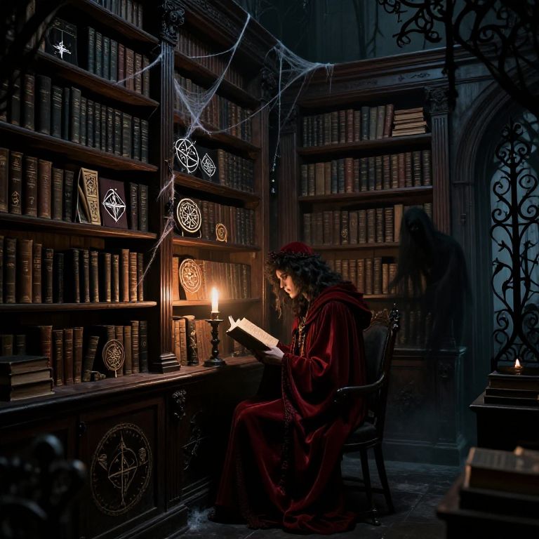 Dark gothic art capturing a dimly lit Victorian library filled with occult books and arcane symbols, dark wood shelves adorned with cobwebs, a lone figure in crimson robes reading by candlelight, surrounded by shadowy spirits and intricate wrought iron details.