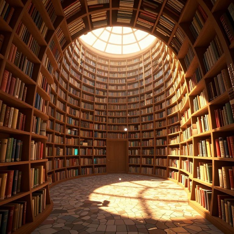 A surreal, cyberpunk-inspired 3D-rendered library spirals upward, bathed in dramatic golden-hour lighting, where books on circular shelves seem to rewrite themselves, casting shifting shadows and sparks of insight onto a mosaic-tiled floor, hinting at the reader's hidden fears and desires.