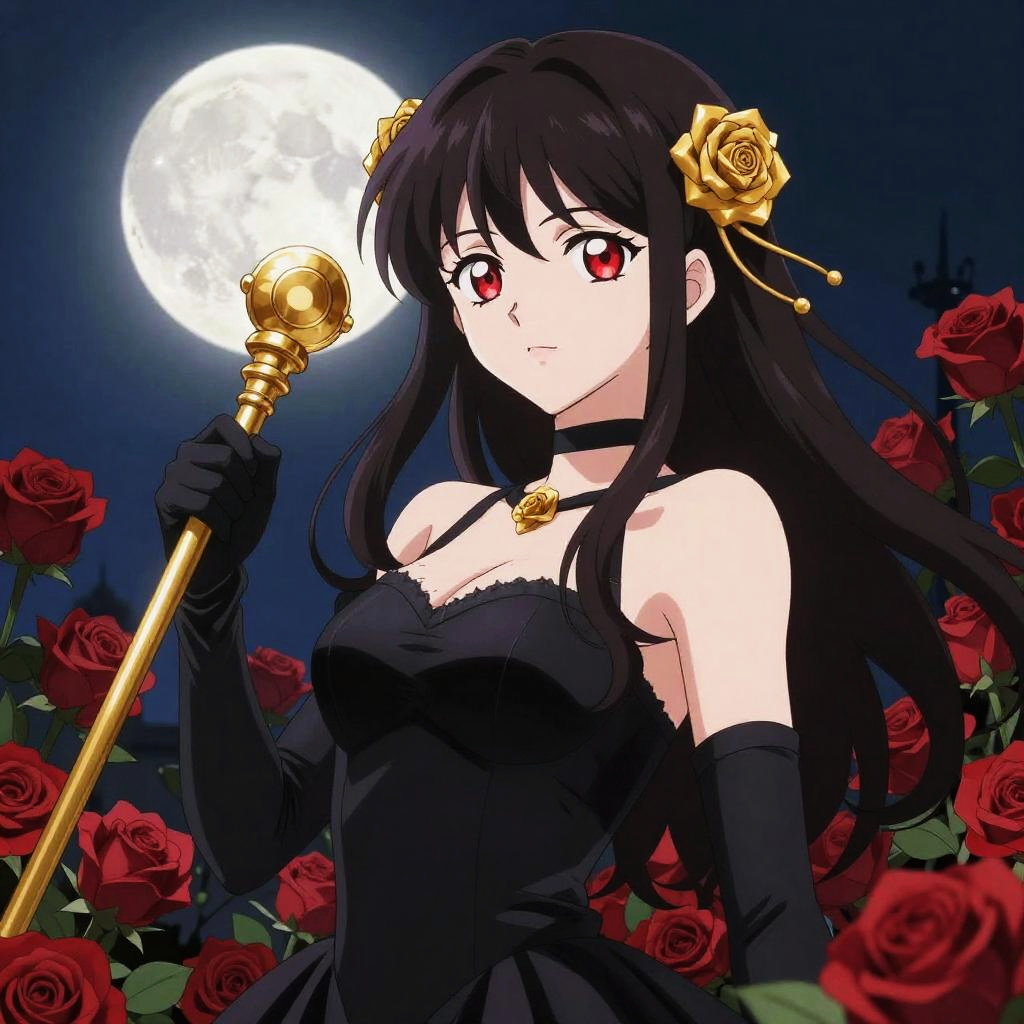 An anime style portrait of a confident young woman with long dark hair adorned with golden rose accessories, wearing a black strap dress and gloves, holding a golden rod, surrounded by red roses under a glowing moonlit night, expressive red eyes, detailed and vibrant colors, fantasy theme