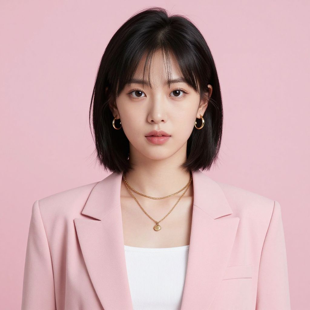 A digitally rendered portrait of a stylish Asian woman with short black hair, wearing a pink blazer over a white top, accessorized with gold hoop earrings and layered necklaces, set against a soft pink background, showcasing a clean and modern aesthetic reminiscent of K-pop imagery.