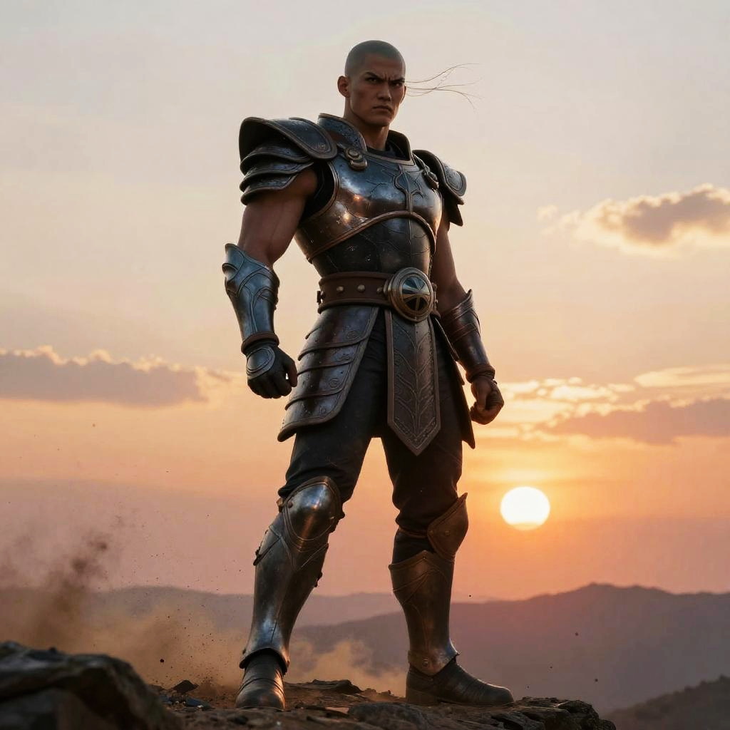 Photograph of a muscular Black man standing in a powerful stance on a rocky hill at sunset. He is dressed in shiny, silver armor with intricate designs, including shoulder guards, a chest plate, arm guards, and a belt with a circular emblem. His bald head is prominent, and his expression is stern. The background features a colorful sunset with orange and pink hues, and distant mountain silhouettes. Dust kicks up around his feet, adding dynamic movement to the scene. The armor reflects the sunlight, creating a dramatic contrast with the warm sky.