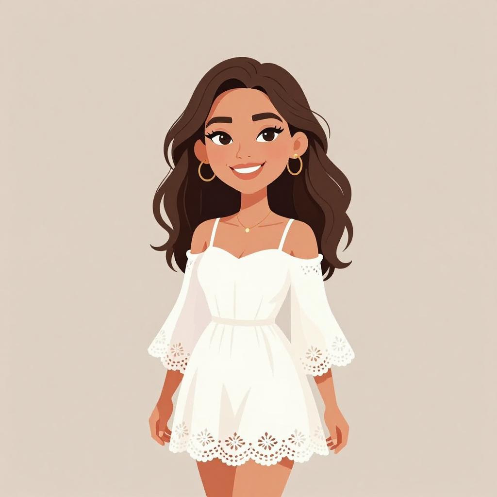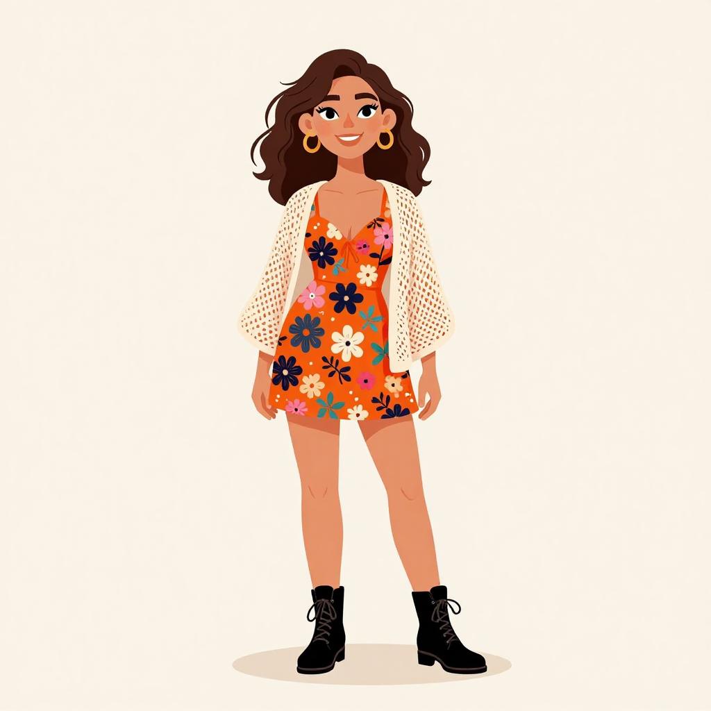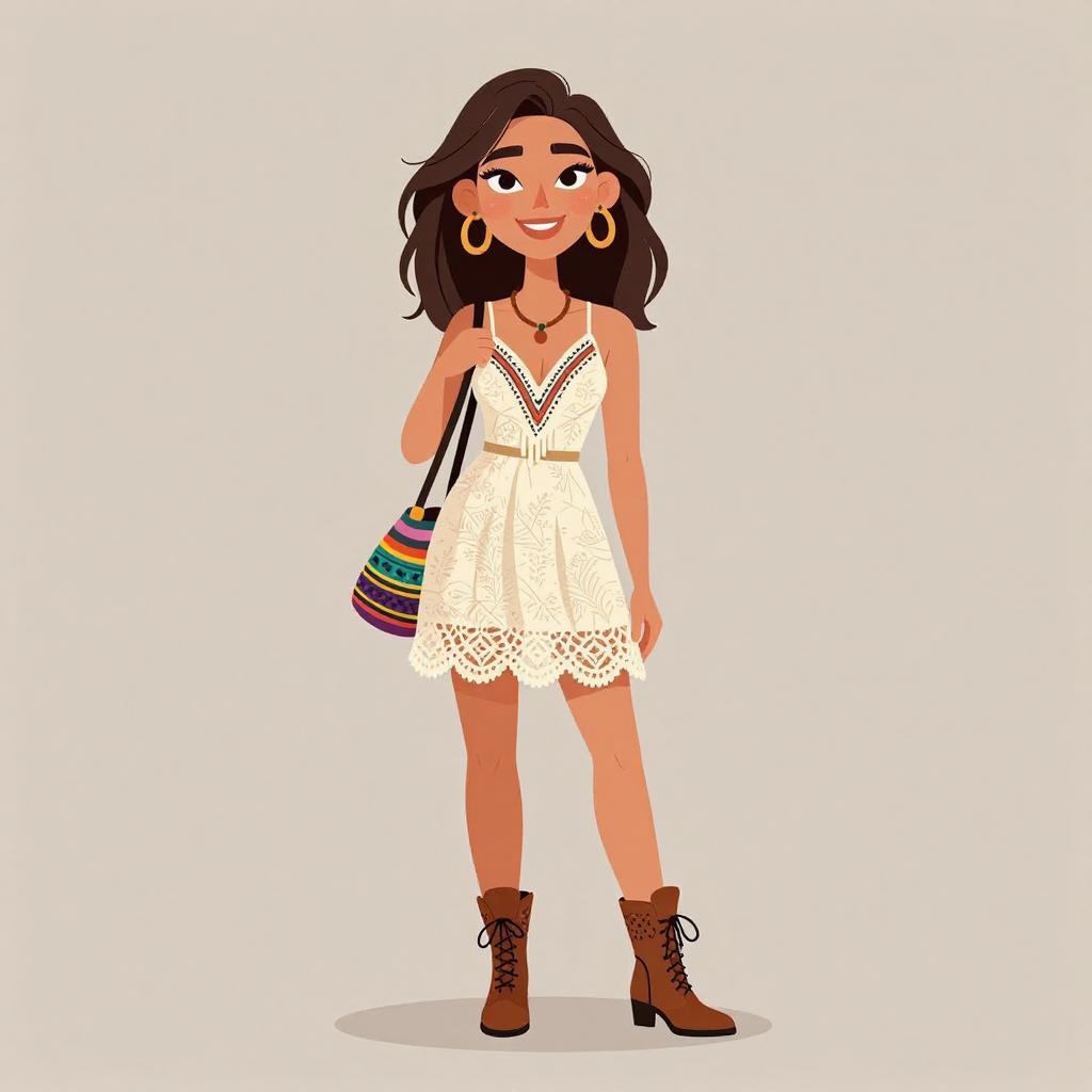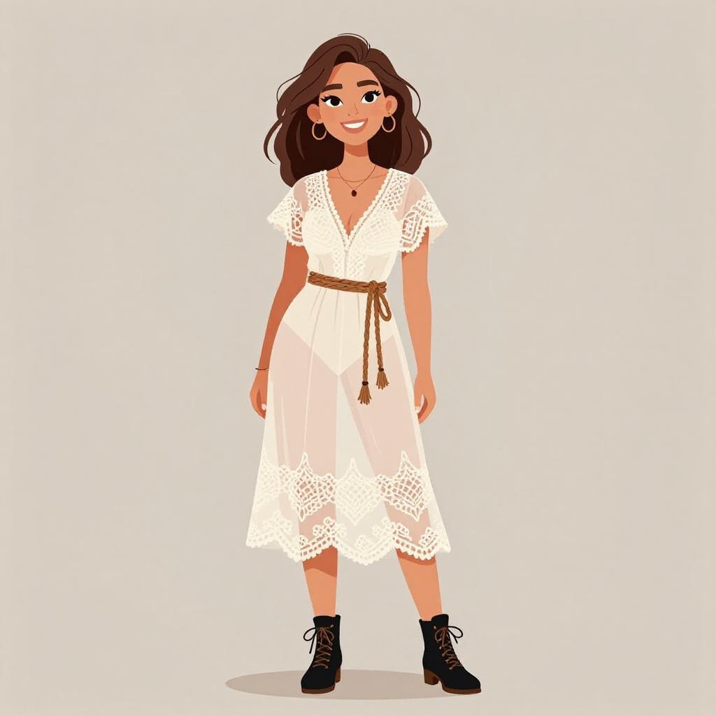 Woman with pretty face and pretty hair. smiling Woman, bohemian chic, sheer off-white lace overlay dress, short flutter sleeves, V-neck, cinched at waist with braided tassel belt, midi-length with raw hem, black lace-up ankle boots, minimal jewelry, neutral studio background. --sref 1467