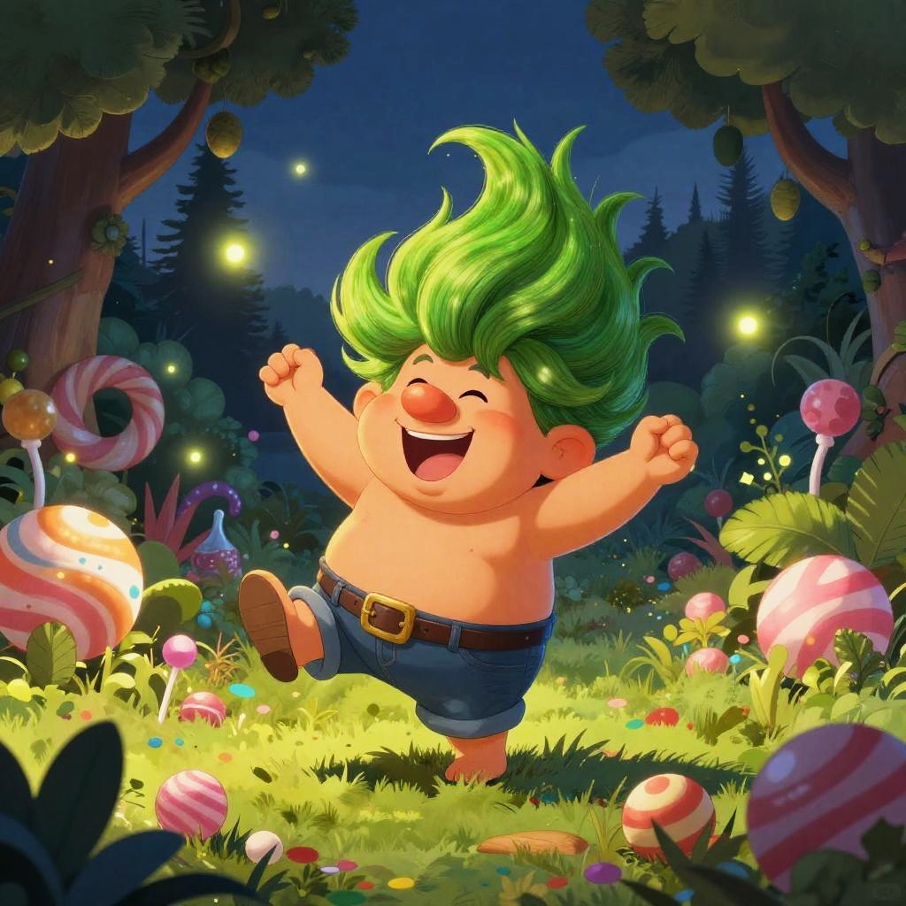 Cartoon baby with green spiky hair, chubby and shirtless, joyfully jumping in a colorful, magical forest filled with glowing candy and fireflies