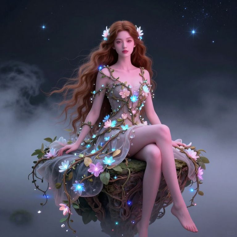 Digital art of a fair-skinned, long-haired fairy with glowing flowers, seated on a floral throne, against a starry, misty night sky