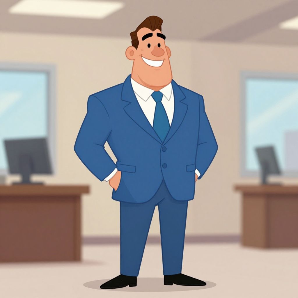 Grimoire cartoon animated man boss/ceo in office, full body, blue suit,low haircut , smiling white smile,hyper realistic,