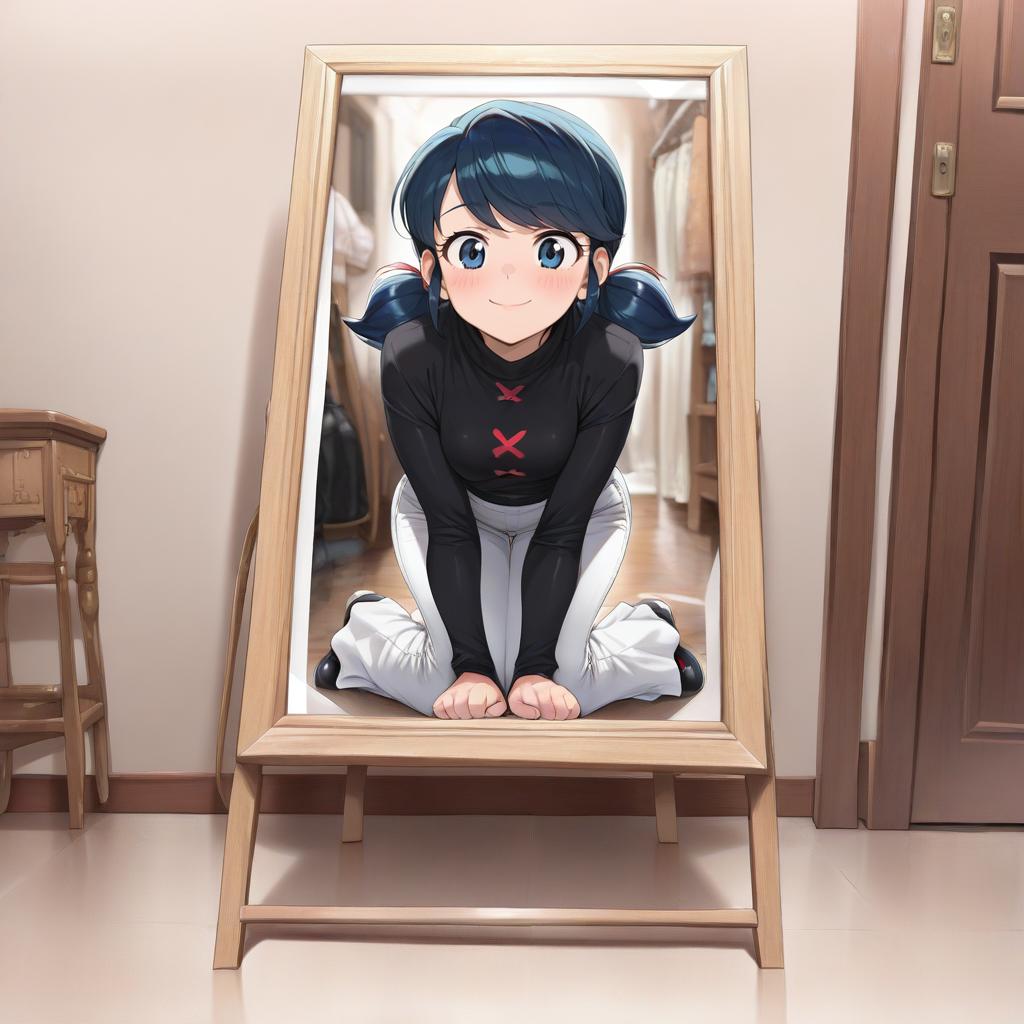 This digital anime-style drawing depicts a young girl with large, expressive blue eyes and dark blue pigtails, kneeling inside a wooden-framed mirror. She wears a black long-sleeved shirt with a red X symbol in the center and white pants. The background shows a hallway with wooden doors and a small wooden stool on the left. The mirror's frame is simple and light brown, while the floor is a smooth, reflective surface. The girl's expression is shy and slightly blushing, adding a sense of innocence to the scene. The overall color palette is soft and warm.