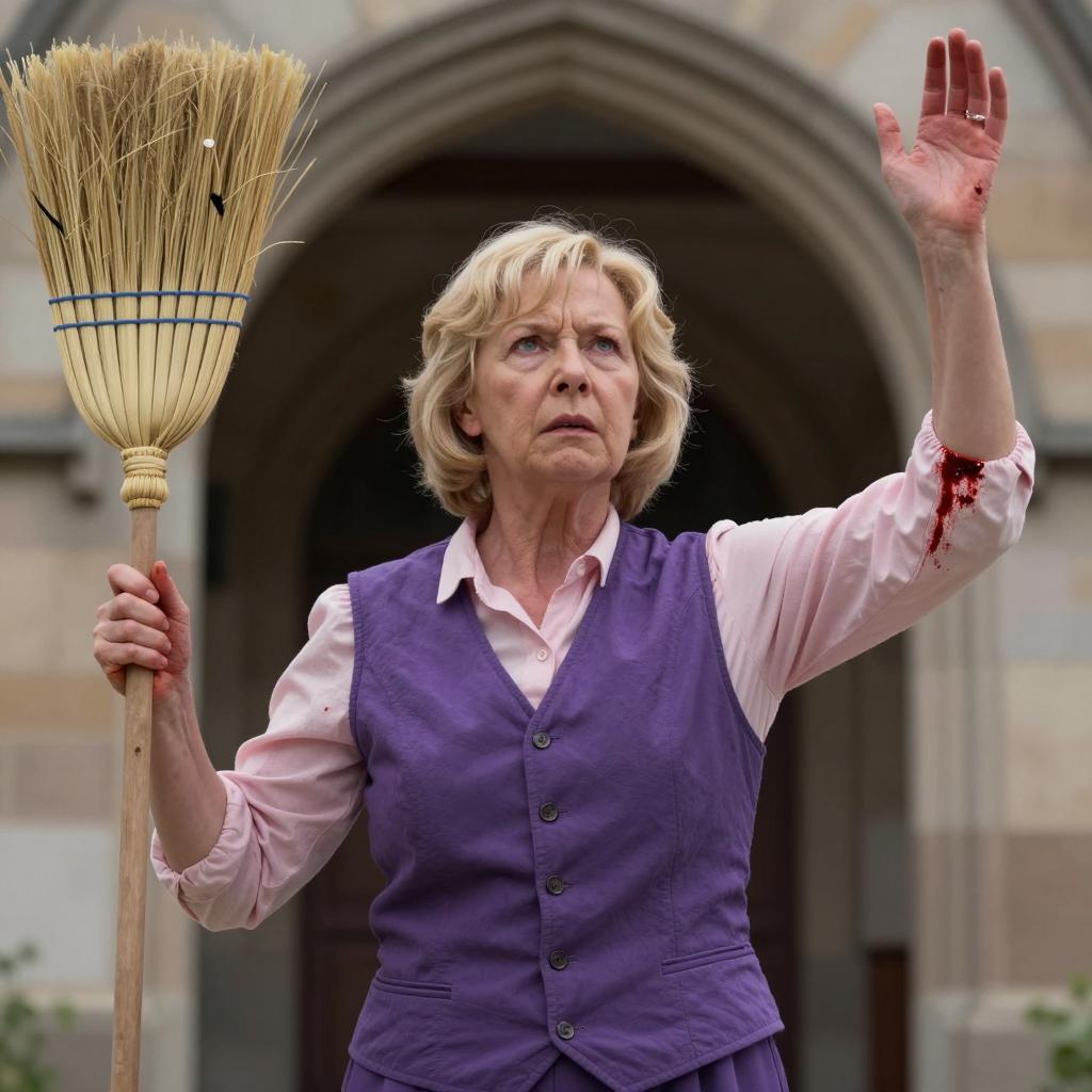 Portrait of a middle-aged woman with short blonde hair, wearing a purple vest over a pink blouse, holding a broom in her right hand. She has blood stains on her left sleeve and left arm, her arms raised in an intense and serious expression. The background features an arched stone building, suggesting a dramatic or cinematic scene.