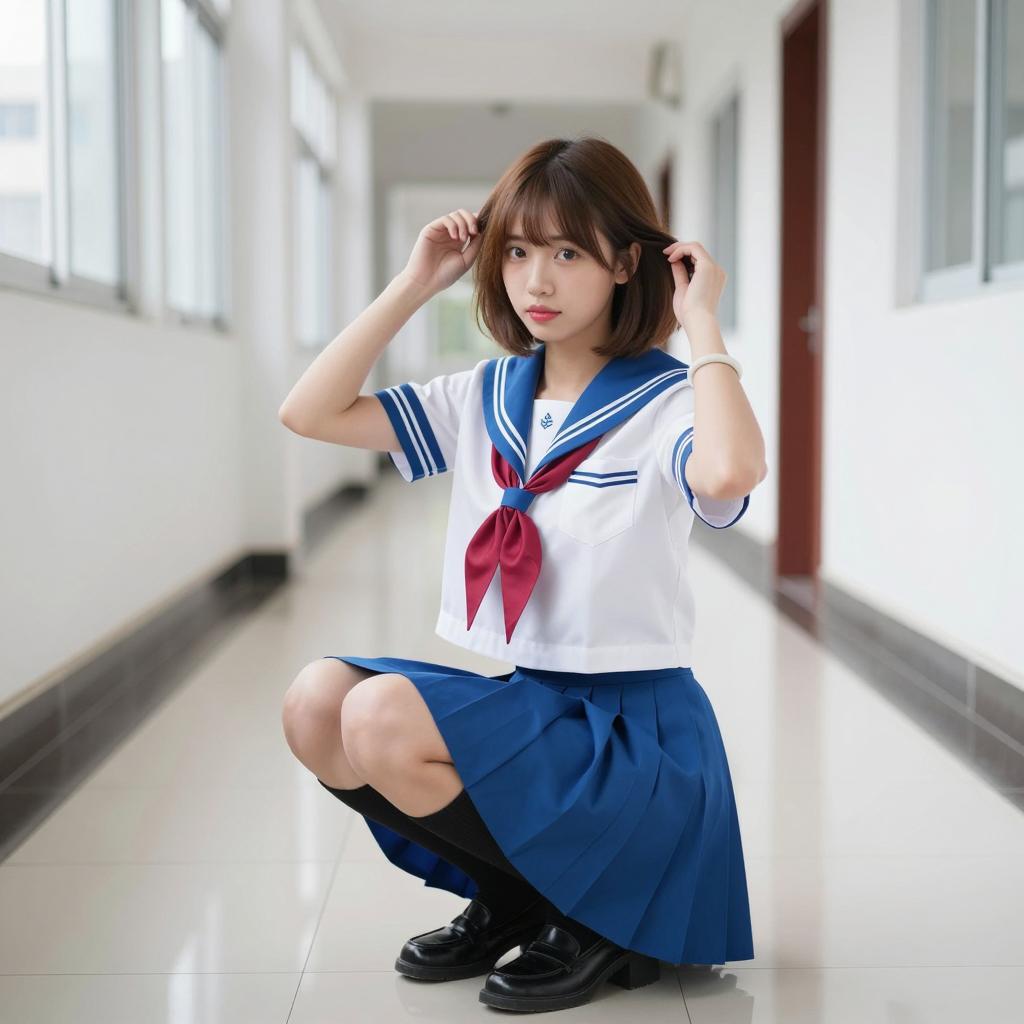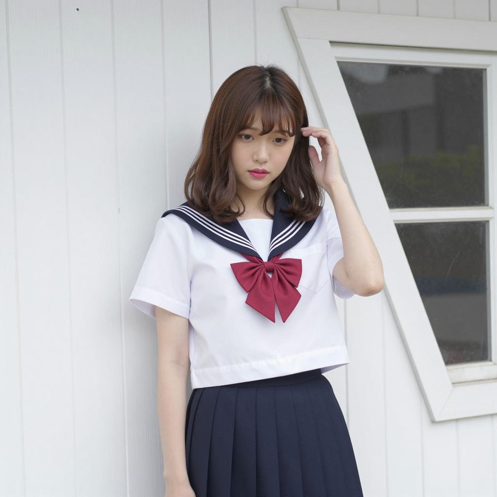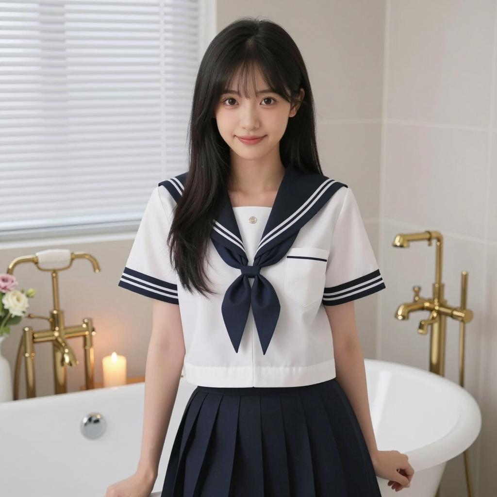 Asian Girl in Sailor School Uniform in Bathroom