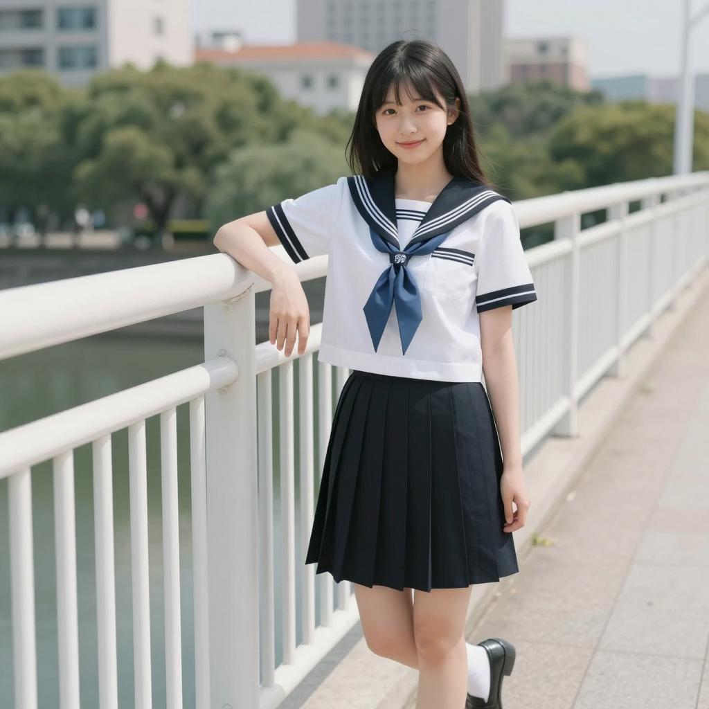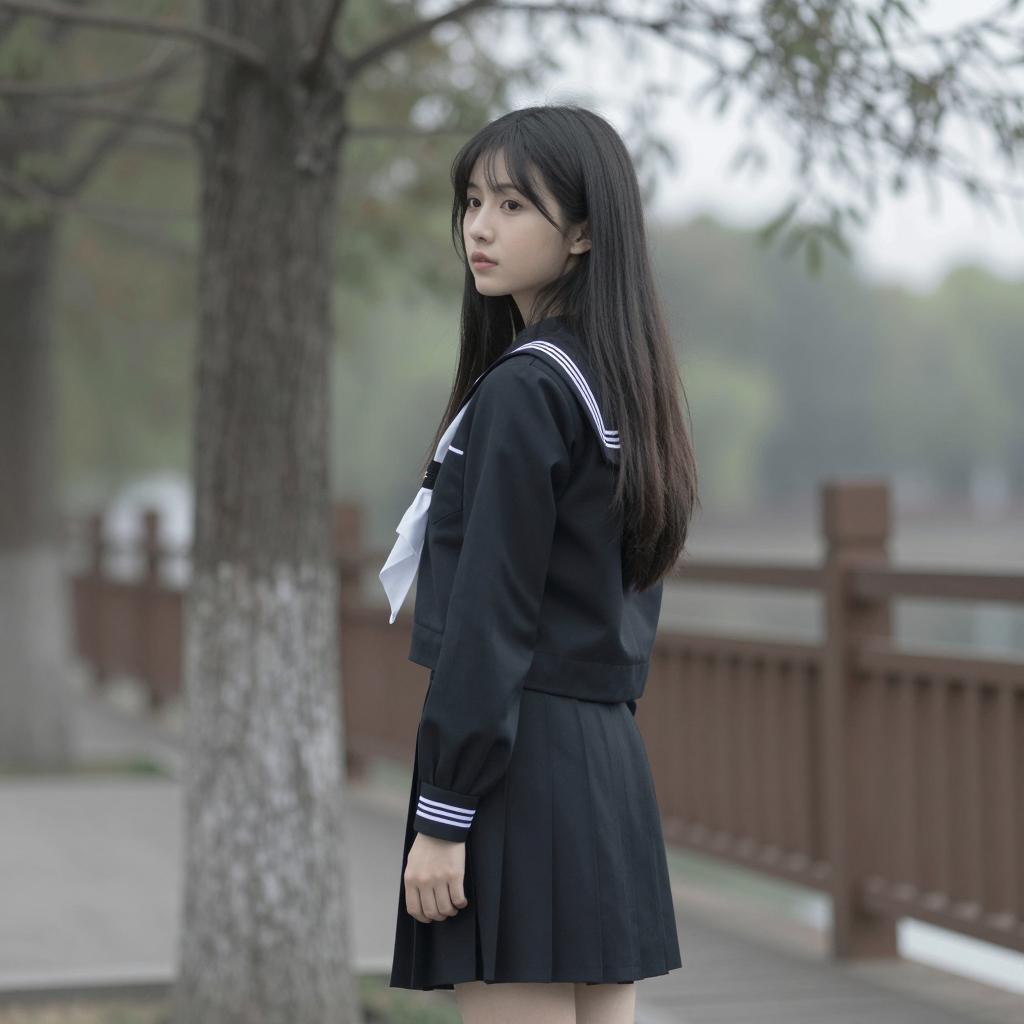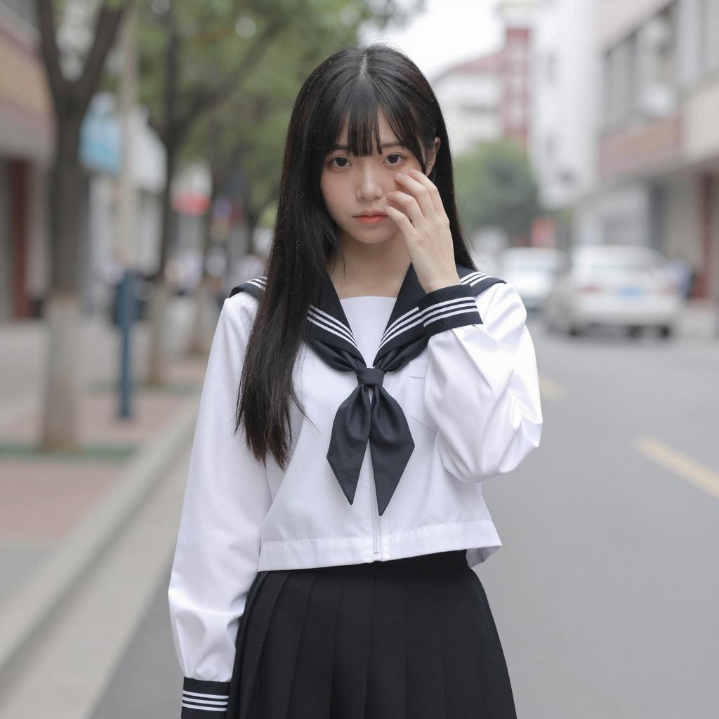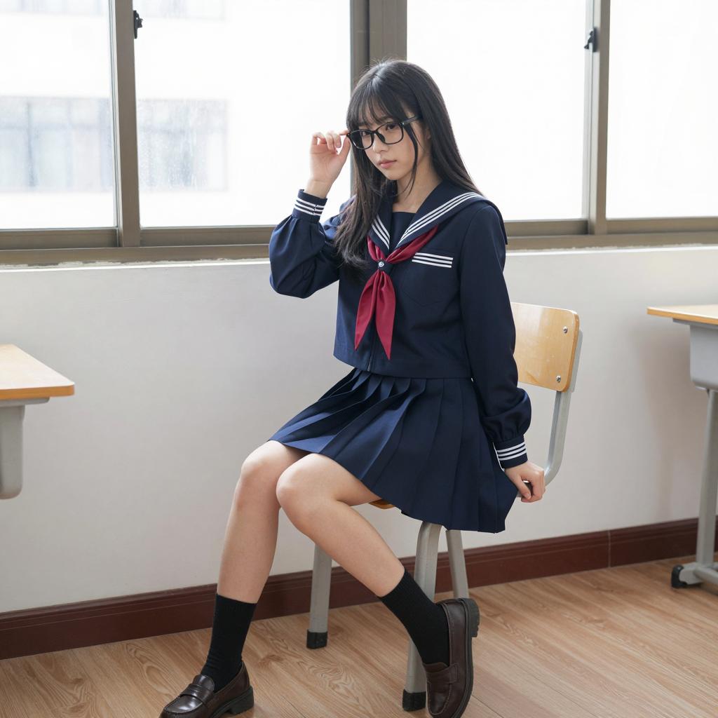 Asian Girl in Sailor School Uniform in Bathroom