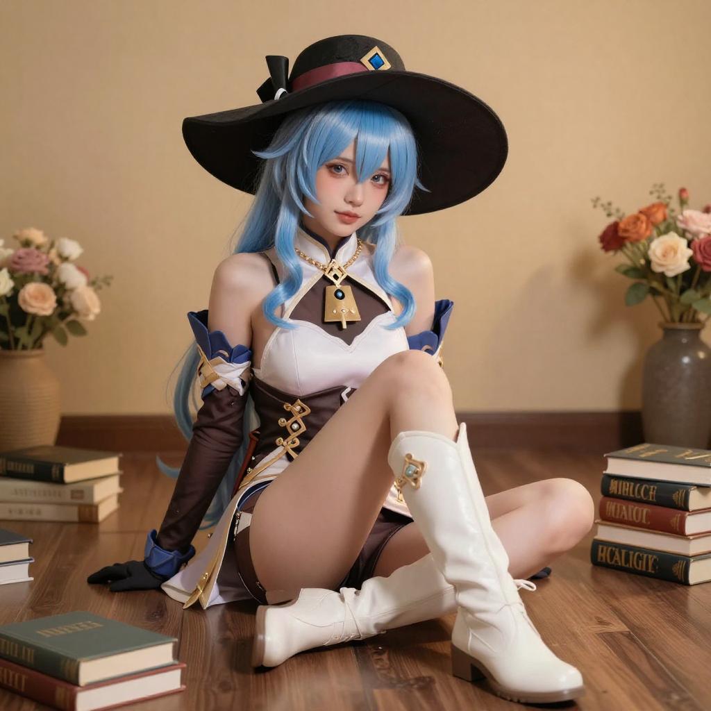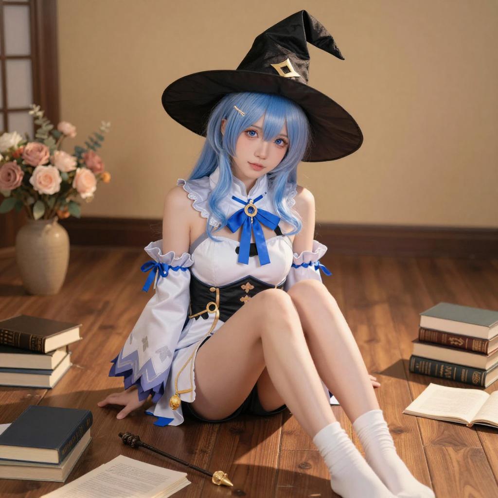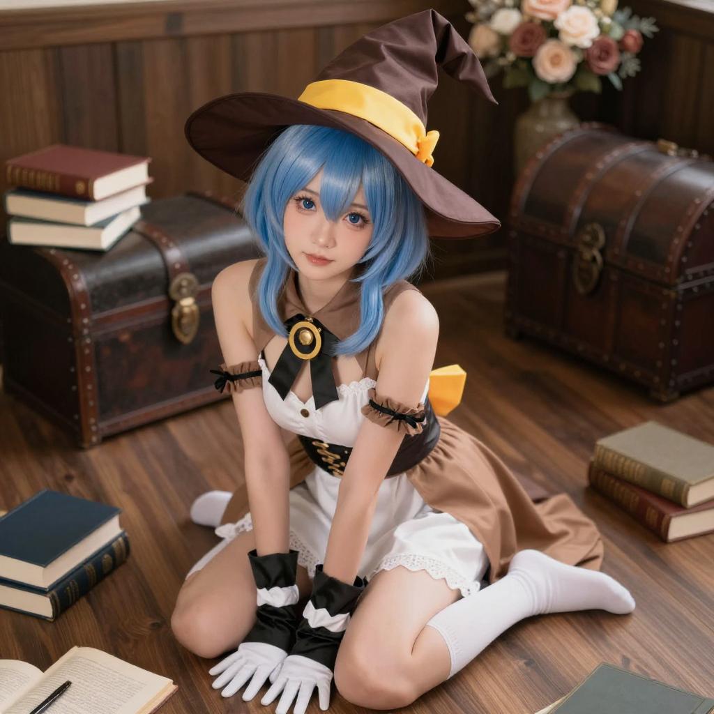 A CGI image of a blue-haired anime-style woman with a large black hat, white and brown outfit, and white boots, sitting nude on a wooden floor. She is surrounded by books, flowers, and a warm, orange-lit background. Her legs are spread, and she has a relaxed, slightly seductive expression.