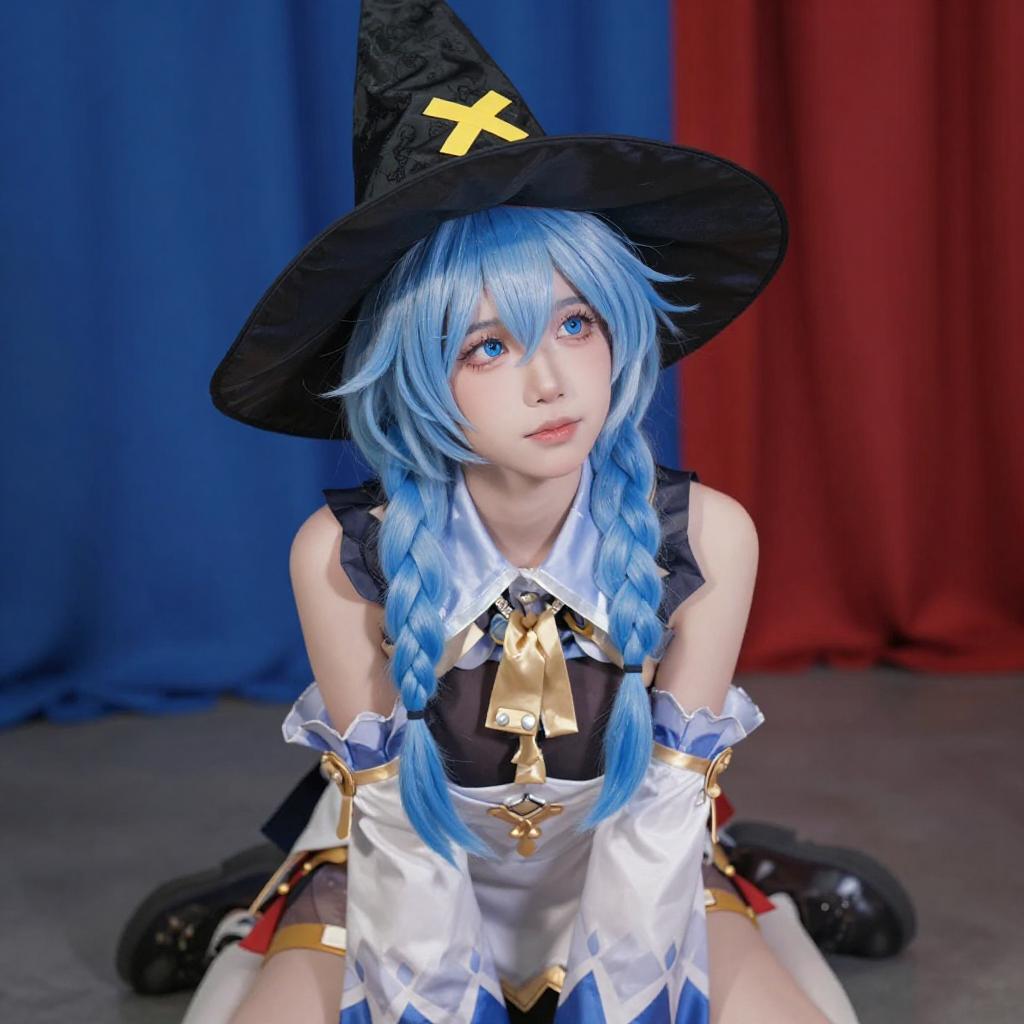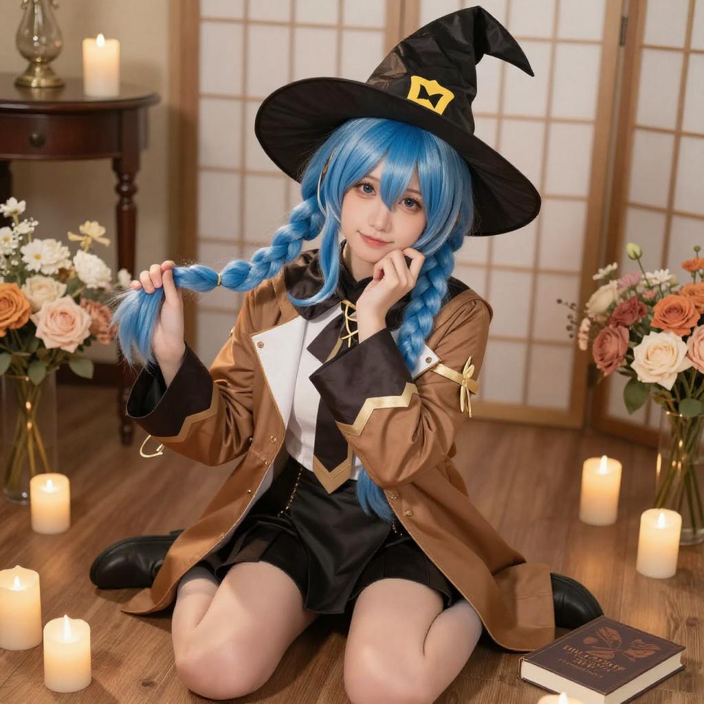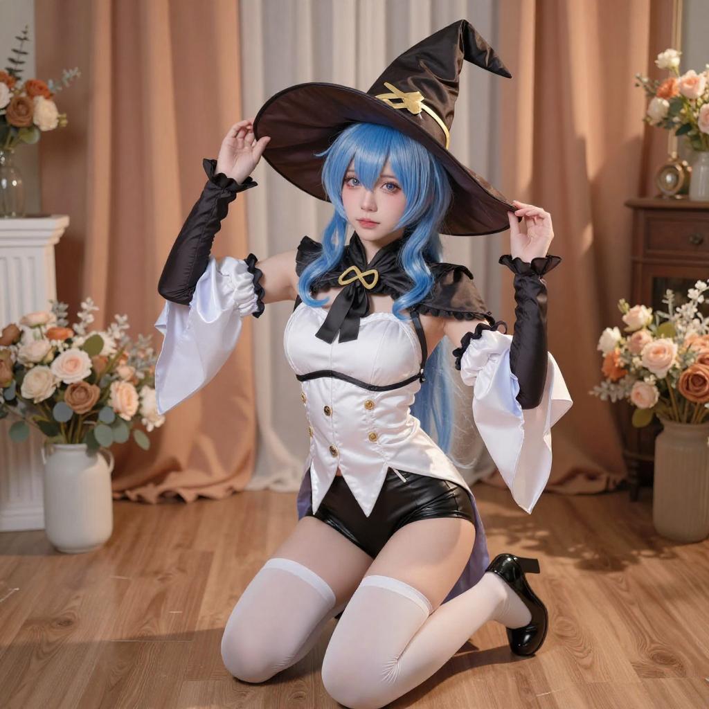 A CGI image of a blue-haired anime-style woman with a large black hat, white and brown outfit, and white boots, sitting nude on a wooden floor. She is surrounded by books, flowers, and a warm, orange-lit background. Her legs are spread, and she has a relaxed, slightly seductive expression.