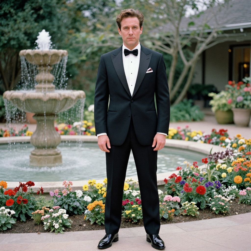 A man, classic black tuxedo, satin peaked lapel, white dress shirt, black bow tie, black patent leather shoes, silk pocket square, lush garden courtyard, cascading water feature, colorful flower beds, 3M ferrania analog film stock, confident expression, soft natural light. Man has masculine face and piercing eyes
