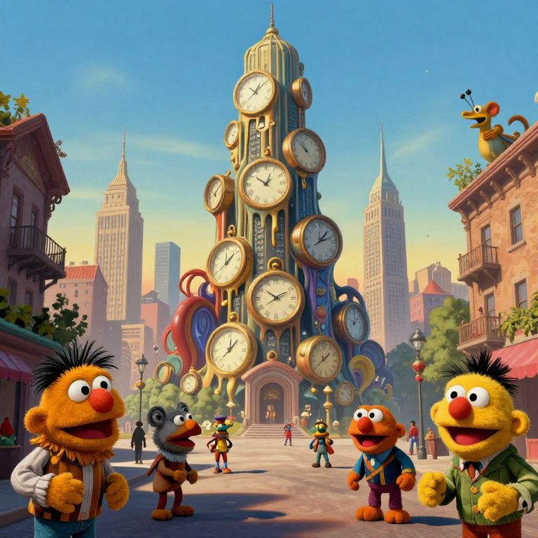 Imagine an enchanting digital artwork that marries the playful charm of Muppet-inspired characters with surrealistic elements reminiscent of Dali's dreamscapes. In this whimsical cityscape, a colossal structure rises from the ground, its form sculpted from cascading timepieces that have seemingly melted into a towering mass. This fantastical skyscraper casts elongated shadows across a lively street bustling with Muppet-like creatures, each exhibiting exaggerated features and expressions that invite both laughter and intrigue. The scene is painted in vibrant hues, creating an emotional tapestry that merges the joyous wonder of Henson's creations with Dali's surreal vision, resulting in a captivating visual journey through a world where the ordinary becomes extraordinary.