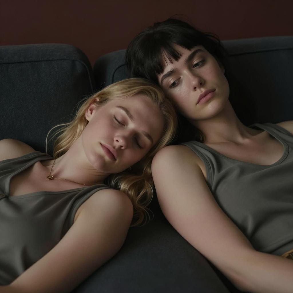Two women in a dimly lit movie theater, sitting close together. The woman on the left has short blonde hair, fair skin, wears a black sleeveless top, and holds hands with the woman on the right. The woman on the right has short blonde hair, fair skin, wears a red short-sleeve top, and has a hairpin. Both have neutral expressions. Red theater seats in the background.