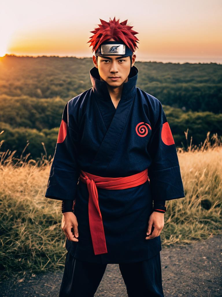 Man in Naruto Akatsuki Costume, photorealistic outdoor portrait at sunset
