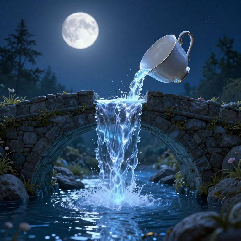 A surreal digital artwork depicts a stone bridge illuminated by moonlight, where a teacup on one side perpetually pours liquid into a stream below, creating a mesmerizing cascade of light that bridges two dimensions, rendered in high-definition detail with a dreamlike, fantasy-inspired aesthetic.