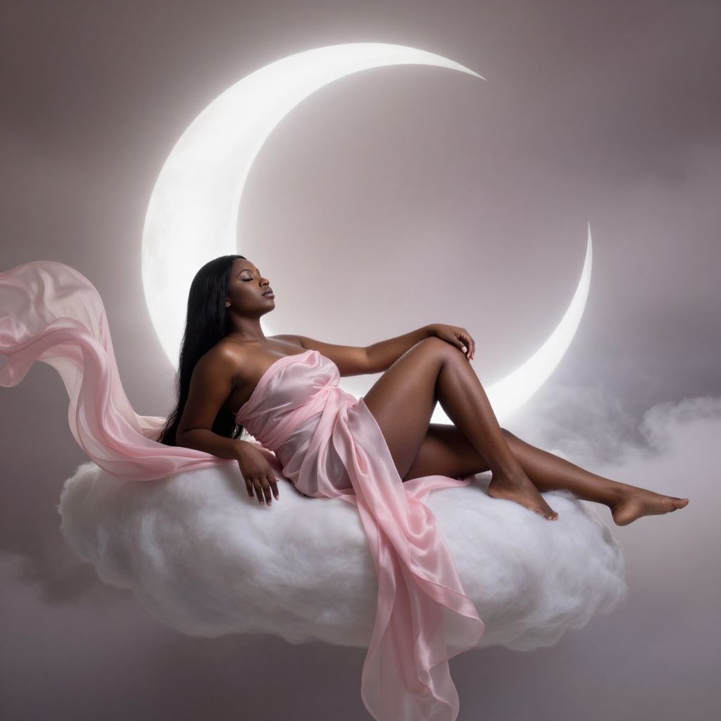 A hyper-realistic digital portrait of a dark-skinned woman with a voluptuous figure and long, sleek hair, posed in a surreal, ethereal setting, She reclines gracefully on a cloud, her head tilted back with her eyes closed, exuding a serene, dreamlike expression, Her body is draped in sheer, light pink fabric that cascades around her in delicate folds, its soft, silky texture enhancing her glowing, smooth skin while revealing her bare legs in a natural, elegant pose, Behind her rises a luminous crescent moon, its striking, ethereal white surface providing a mesmerizing contrast to the soft pastels and grays of the stormy and misty clouds that swirl in the background, The interplay of textures—the flowing fabric, the smooth crescent moon, and the fluffy clouds—creates a dynamic yet harmonious composition, Muted colors and subtle lighting lend a mystical quality, with soft highlights accentuating her form and blending fantasy with realism to craft a powerful, emotionally evocative image, flawless anatomy