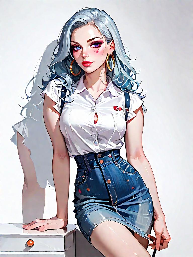 1girl, source_comics, realistic face, full body shot, Woman, casual contemporary, denim mini dress in dark wash, square neckline, thin straps, button-down front with silver buttons, fitted waistline, slight A-line skirt, hoop earrings, light makeup, neutral photo studio background.
