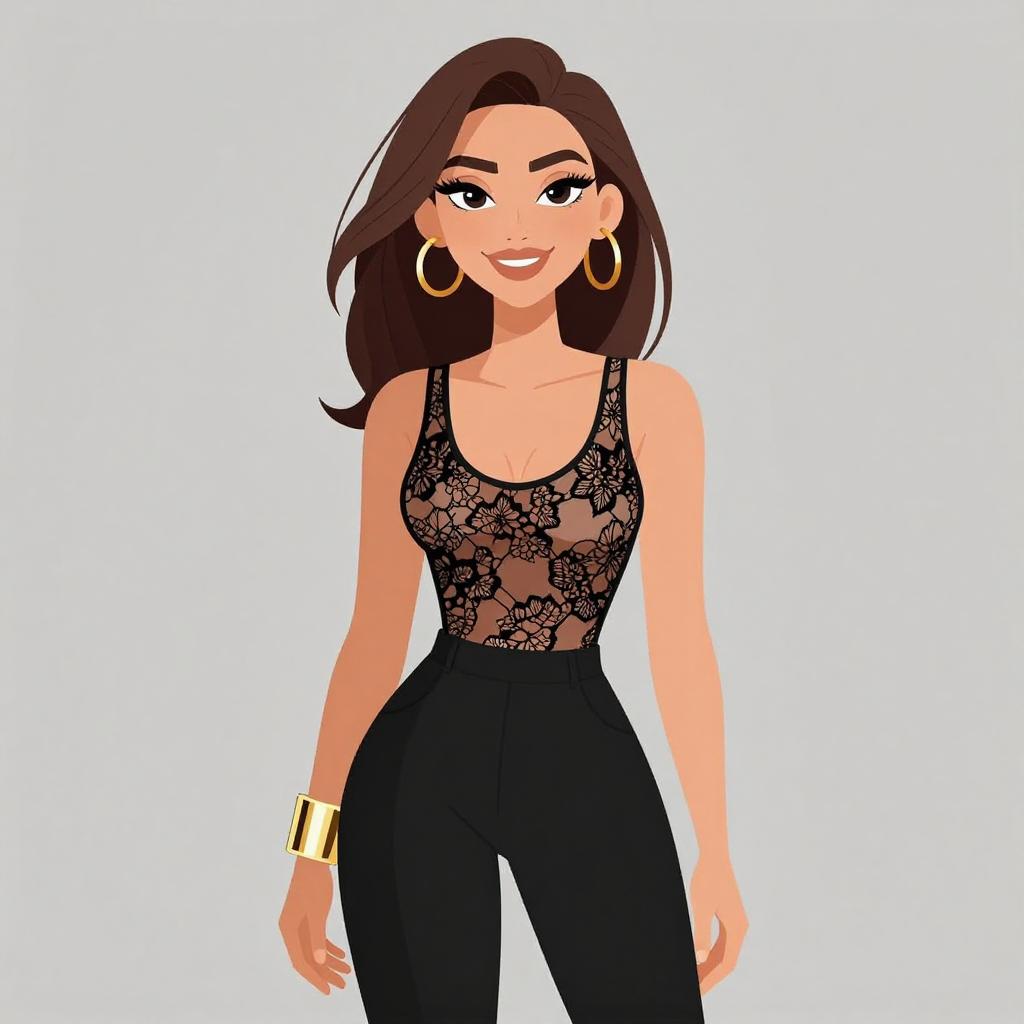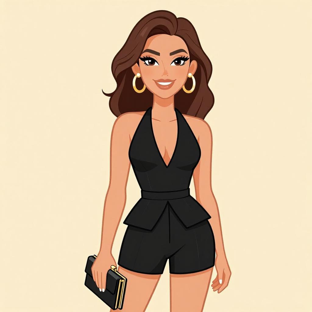Woman with pretty face and pretty hair. smiling Woman, glam, glittering halter top in black with gold speckles, high neckline, sleeveless, tucked into black faux leather pants, skinny fit, high-waisted, dangling gold earrings, holding a black clutch. --sref 1467