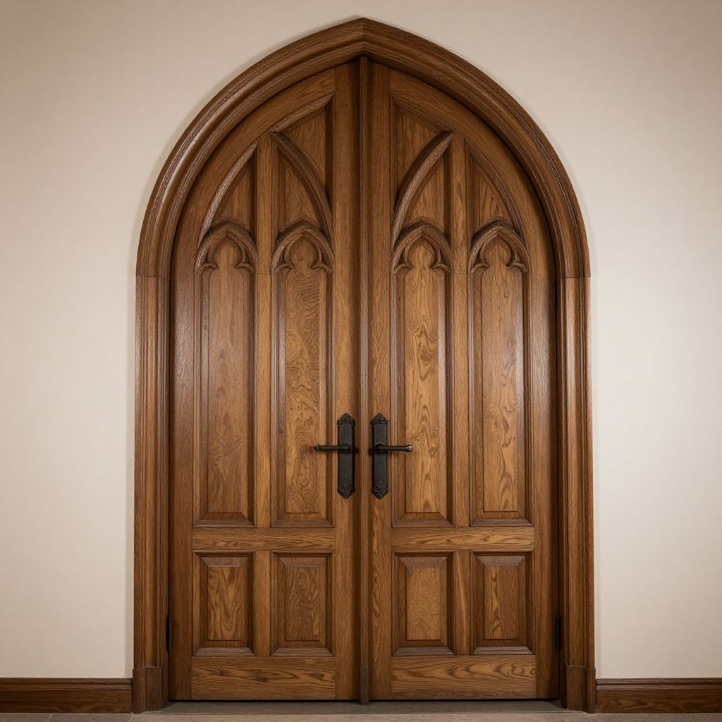 Gothic-inspired wooden double doors, crafted from rich oak, stand elegantly against a plain wall, featuring arched tops, intricate paneling, and dark metal hardware, showcasing both age and meticulous polish.