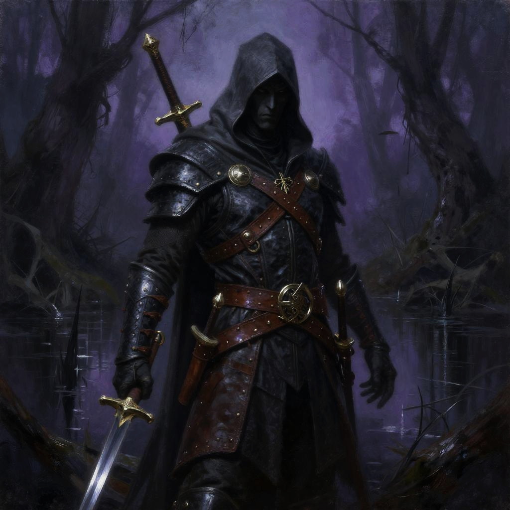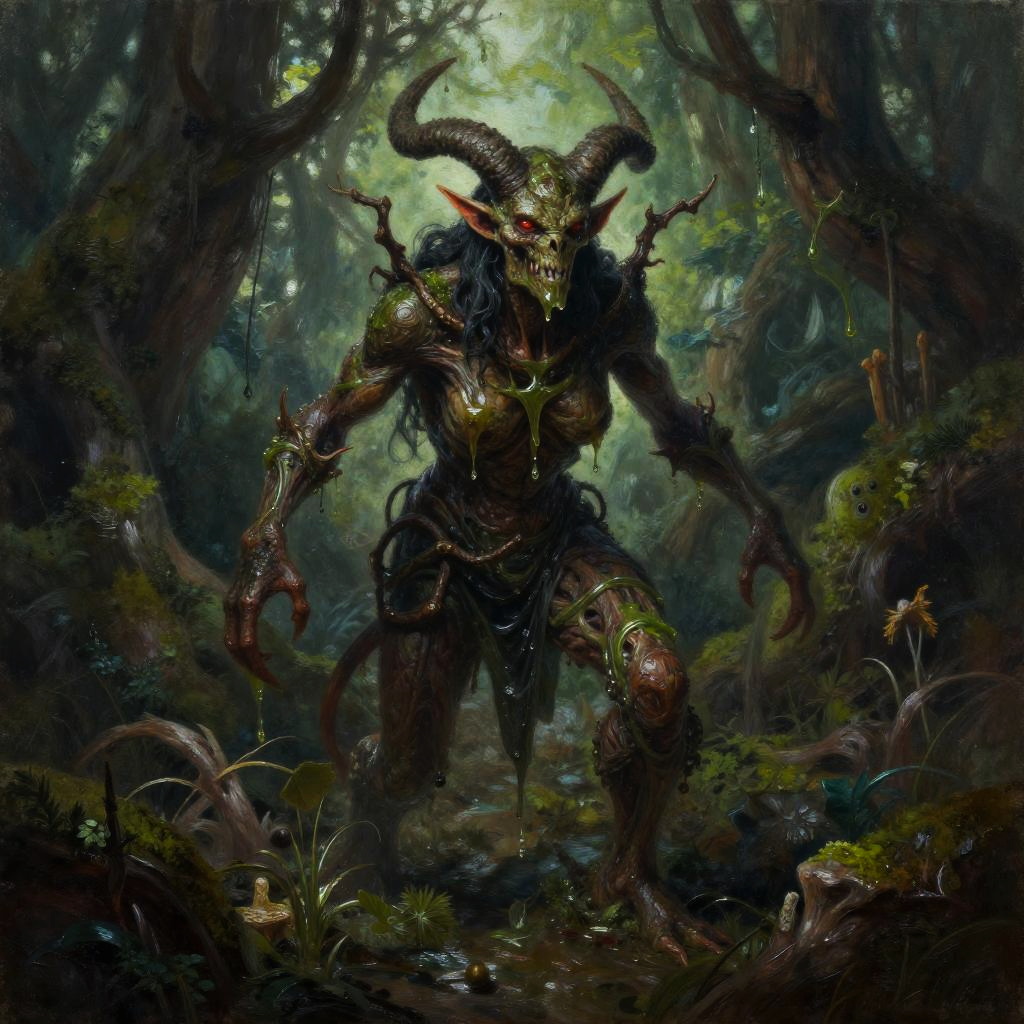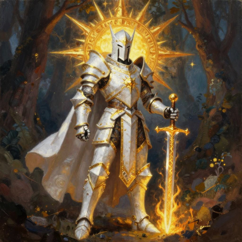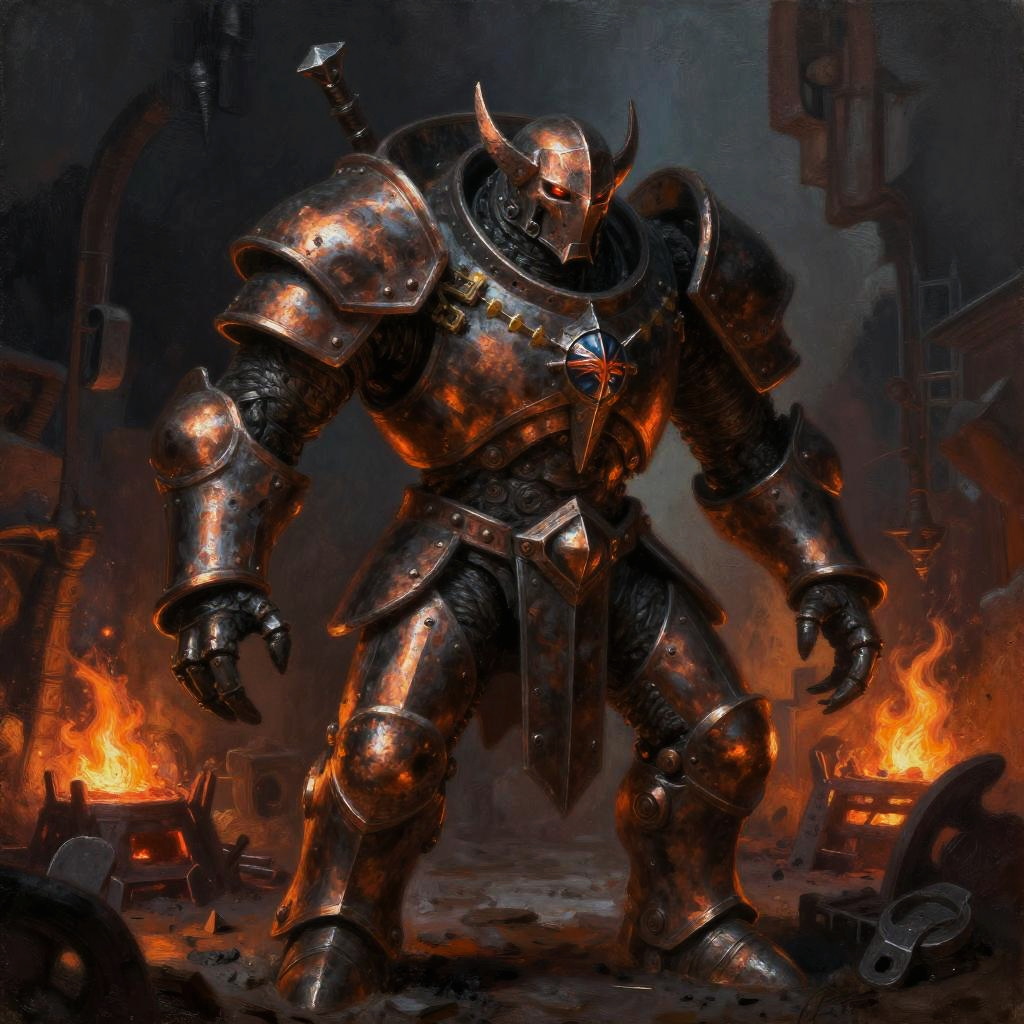 Warhammer fantasy RPG style iron-clad blacksmith golem, highly detailed oil painting with burnished copper and soot black tones. Set in a mystical forge with forged metal joints and glowing forge embers, evoking a dark and ominous atmosphere.