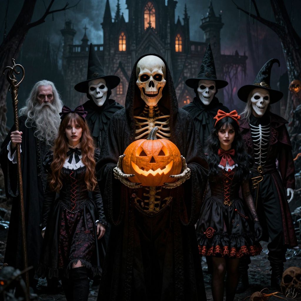 Digital artwork depicting six Halloween-themed figures in a dark, eerie forest with a gothic castle in the background. At the center, a skeleton in a black robe holds a glowing, carved pumpkin with a sinister grin. Surrounding him are five others: two adults with skull masks and black hats, and two children with similar attire, one with red bows. A bearded man with a staff stands on the left. The children wear black dresses with white collars, and the adults are in tattered black robes. The scene is bathed in dark blue and purple hues, with leafless trees and a misty atmosphere.