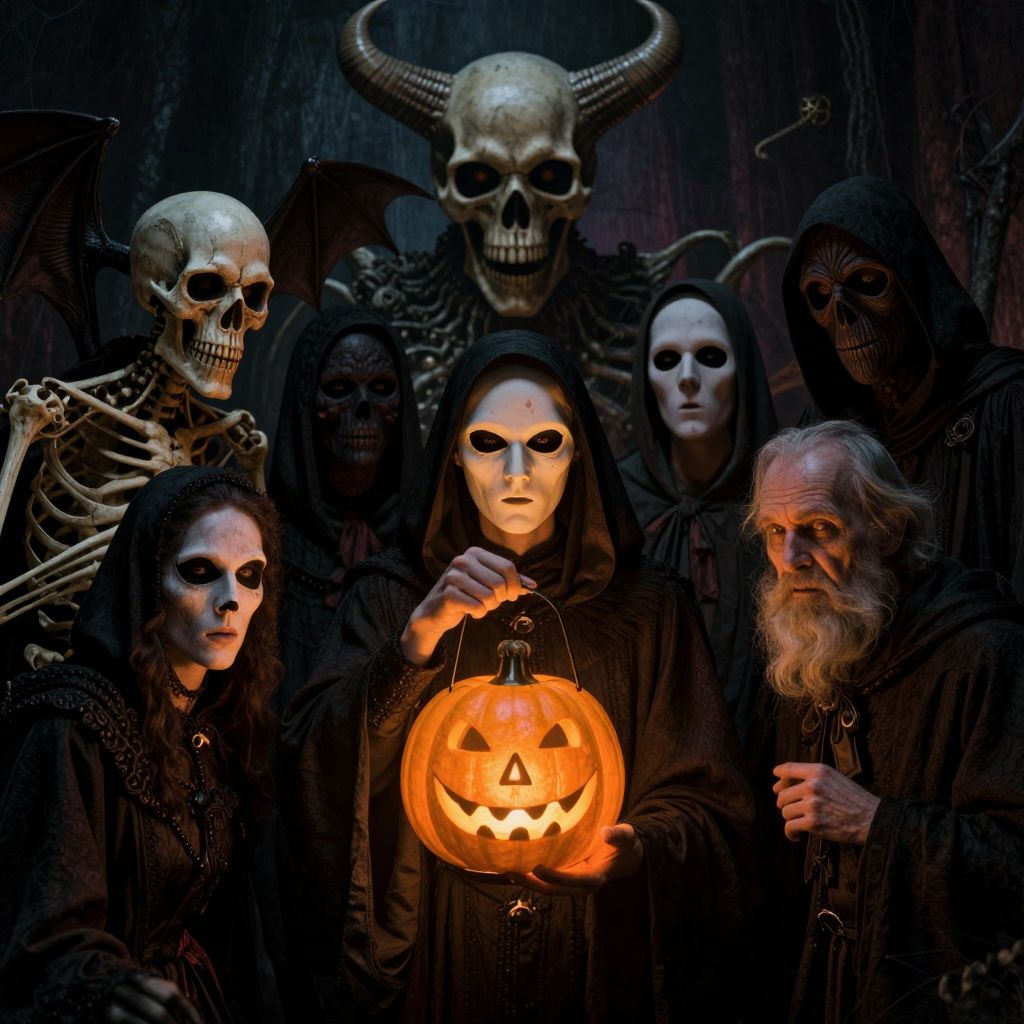 The image depicts a dark, eerie scene filled with a cult of Halloween-worshippers, each adorned in sinister attire. The central figure, a skeletal figure with glowing eyes, stands prominently in the foreground, holding a lit pumpkin with a carved face. Surrounding this figure are various other characters, including a bearded man with a staff, a woman with long hair and a bow, and several others with grotesque masks and hats. The background features a gothic castle with lit windows, adding to the ominous atmosphere. The overall composition is reminiscent of the works of artists like Frank Frazetta, Bernie Wrightson, and Mike Mignola, with its dark, mystical, and somewhat Boschian elements. The scene is rich in texture, with detailed costumes and props, and the interplay of light and shadow creates a sense of depth and mystery.